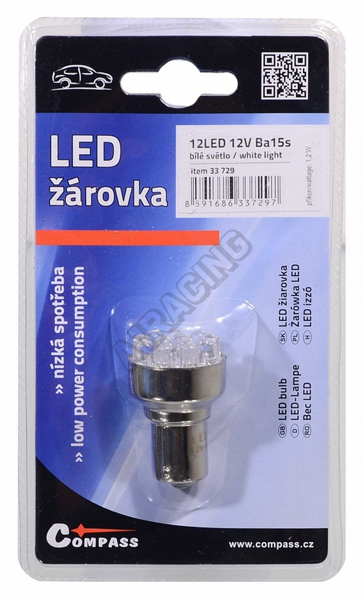 12 LED žárovka s nízkým odběrem proudu. Patice BA15s, bílé světlo, balení 1ks. LED diody s paticí k