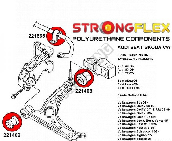 Audi TT 2007-... StrongFlex sestava silentbloků jen pro přední nápravu 6 ks obsahuje: