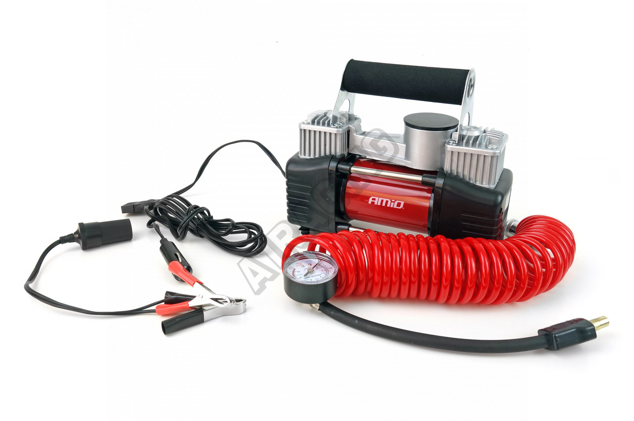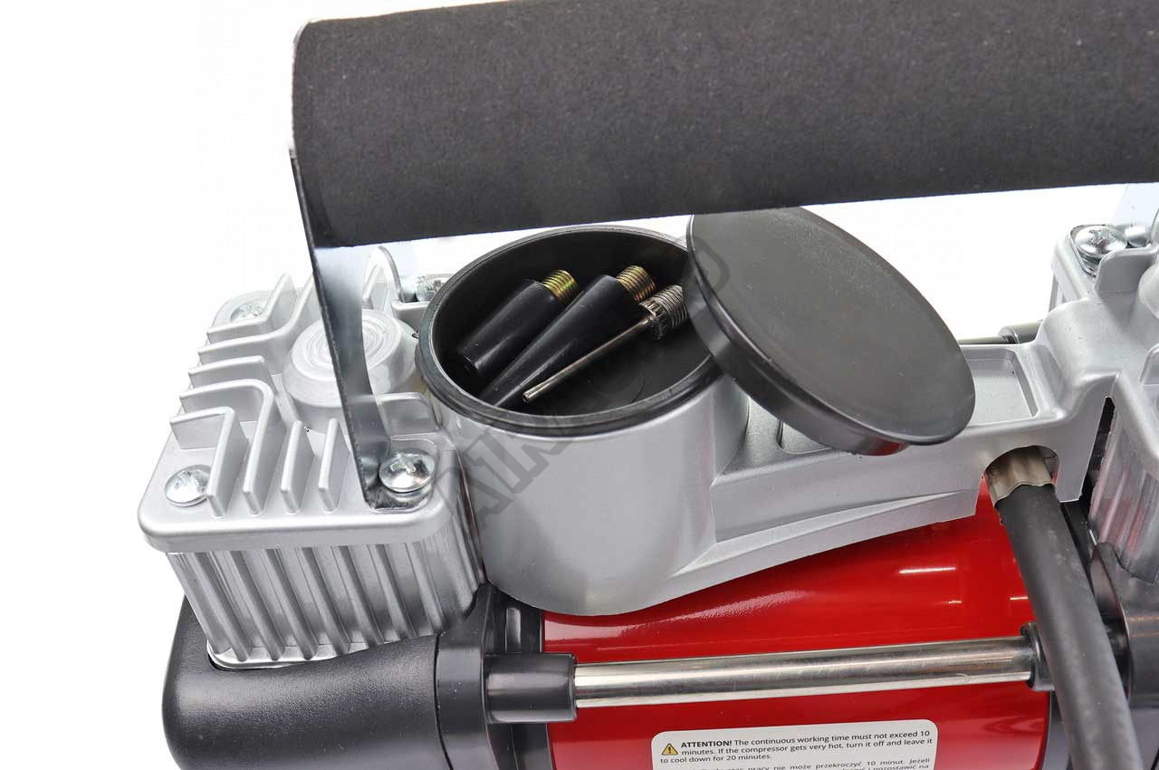 Výkonný kovový dvoupístový kompresor s manometrem. Kompresor je určen pro čerpání kol, míčků, nafukovacích člunů, bazénů a dalších, díky třem různým koncům ventilů obsažených v sadě. Zvládnu velká 4x4 kola - SUV - Van - Truck - Camping