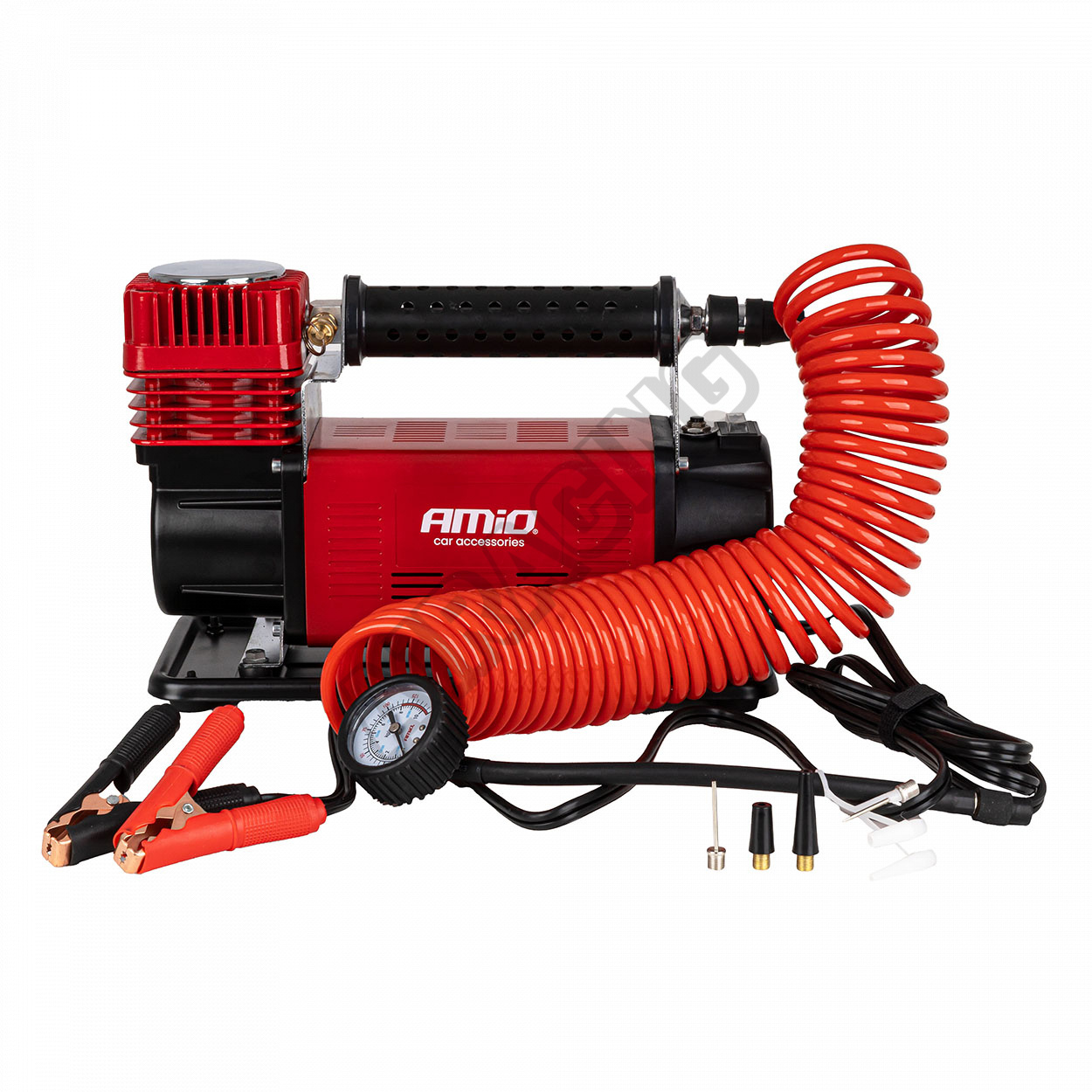 Kompresor je vybaven flexibilní vzduchovou hadicí o délce 8 m a napájecím kabelem 2,4 m, což umožňuje volné operování kolem vozidla. V sadě se nacházejí tři vyměnitelné koncovky pro pumpování různých typů ventilů – automobilových, cyklistických a pro sportovně-rekreační příslušenství.