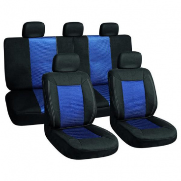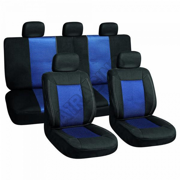 Univerzální potahy na přední a zadní sedadla včetně 5ks opěrek hlavy. • Lze použít na sedadla s airbagy. • Složení svrchního materiálu: 100% Polyester • Barva: černá/modrá