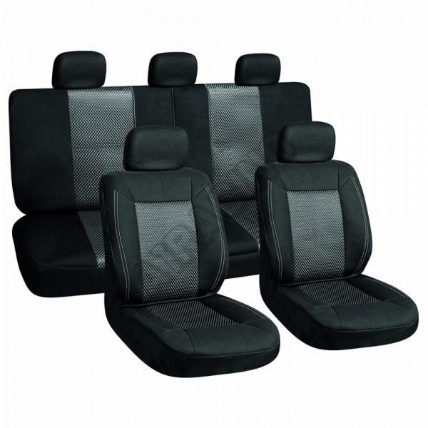 Univerzální potahy na přední a zadní sedadla včetně 5ks opěrek hlavy. • Lze použít na sedadla s airbagy. • Složení svrchního materiálu: 100% Polyester • Barva: černá/šedá
