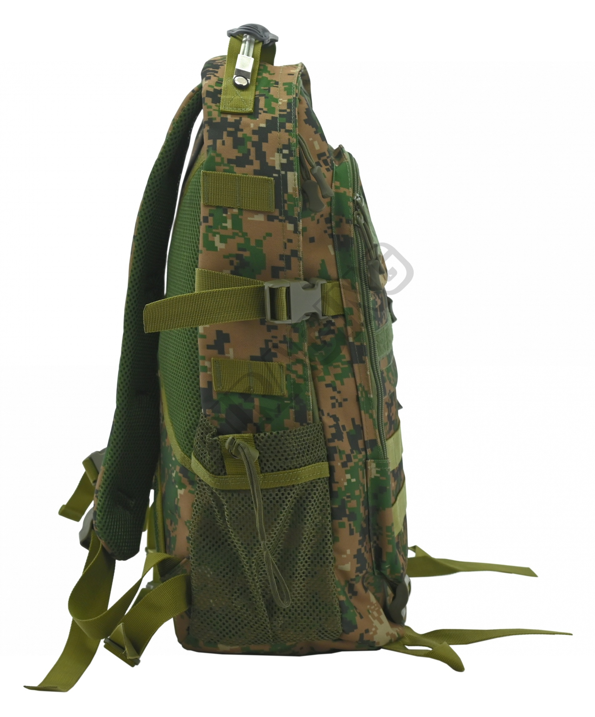 Boky tašky jsou opatřené sítěnou kapsou se stahovací šňůrou. Vrchní část je opatřena bytelnou rukojetí s ocelovým lanem. Čelní strana batohu je doplněna Molle systémem pro uchycení různého vybavení.