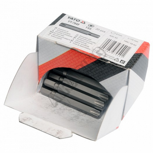 Kvalitní bity Torx bezpečnostní T55 v sadě 20 kusů, kované do vysoké přesnosti s pískovaným povrchem. Jsou vyrobený z chrom - molybdenové slitiny oceli AISI - S2. Dosahují povrchové tvrdosti 58-62 HRC. Každý bit má velikost upínacího šestihranu 1/4", což je velikost klasického bitu tak, jak ho znáte. Bity svou kvalitou vyhoví náročnému uživateli.