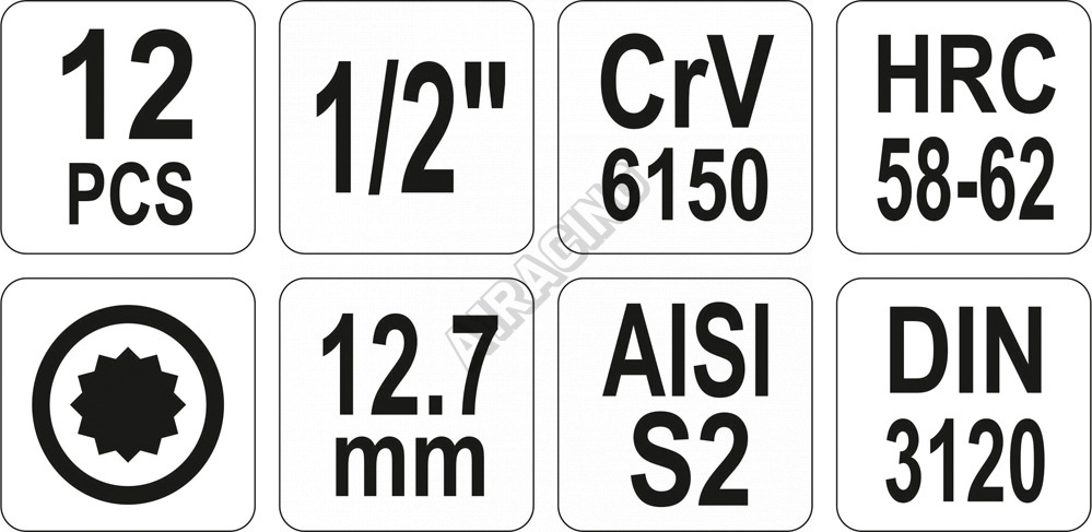 • XZN (SPLINE) na hlavici 1/2" • M5 x 180 mm • M6 x 70 / 140/ 250 mm • M7 x mm • M8 x 100 / 120 mm • M10 x 120 / 140 mm • M12 x 50 / 140 mm • M17 x 50 mm • Vyrobeno z chromvanadiové slitiny oceli CrV 6150 / S2 • Tvrzeno na tvrdost HRC58-62 / DIN3120