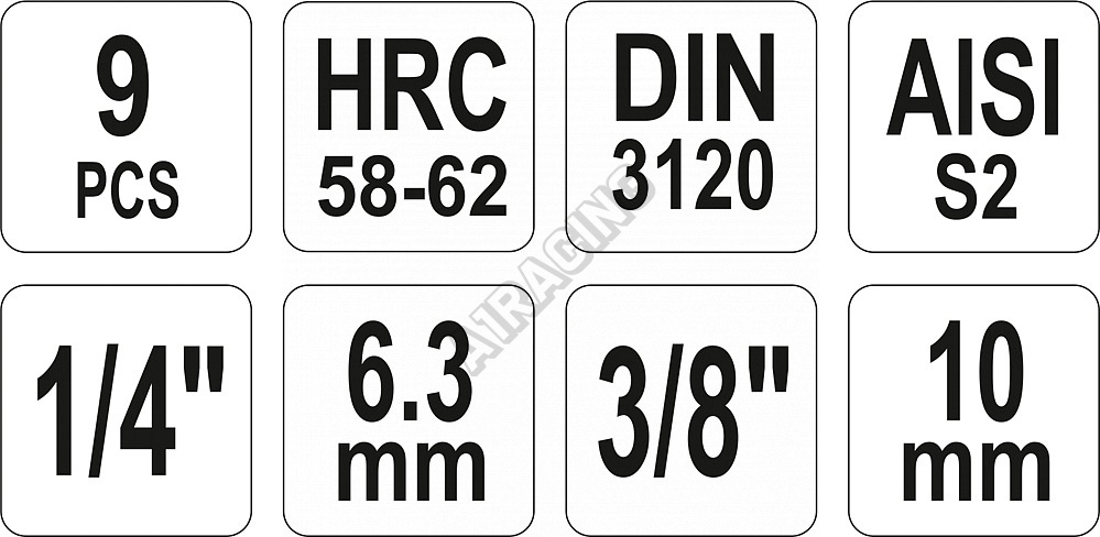 Délky bitů 37 a 48 mm, určené pro 1/4" a 3/8" ráčny. V sadě je kovový držák bitů a samotné bity H2, H3, H4, H5, H6, H7, H8, H10, H12. Splňuje normu DIN 3120 pro vysoce-zatěžovatelné nástavce.