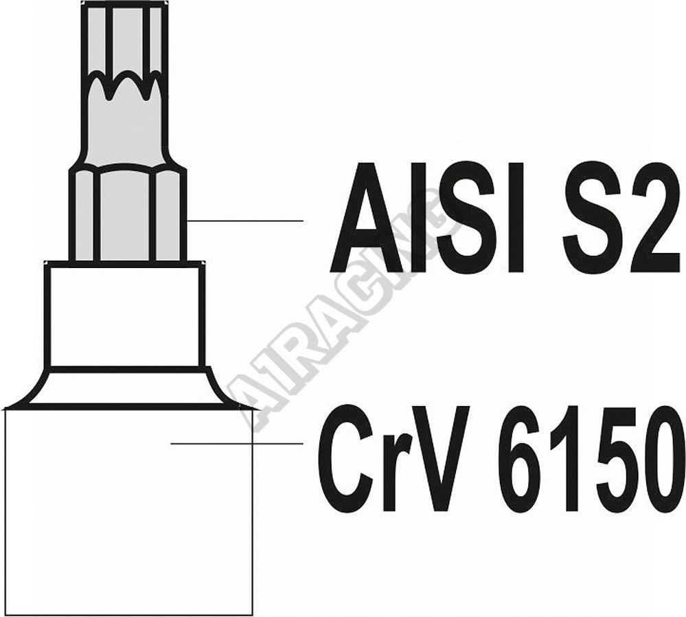 Adaptéry bitů jsou zhotoveny z odolného materiálu CrV 6150. Jednotlivé bity pak z vysoce kvalitního materiálu AISI S2 s tvrdostí HRC 58-62 a finišovací úpravou poniklování.