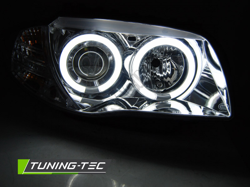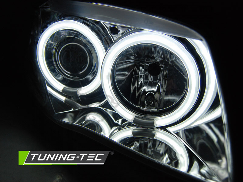 Čirá optika s chrom pozadím s bíle silnýma CCFL svítícíma kroužkama efektně vylepší váš model, světla mají EU homologaci, osazena jsou žárovkama H7, cena je za celou sadu 2 ks