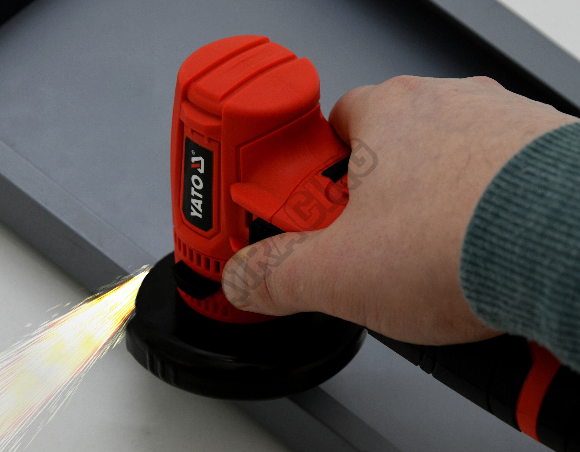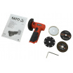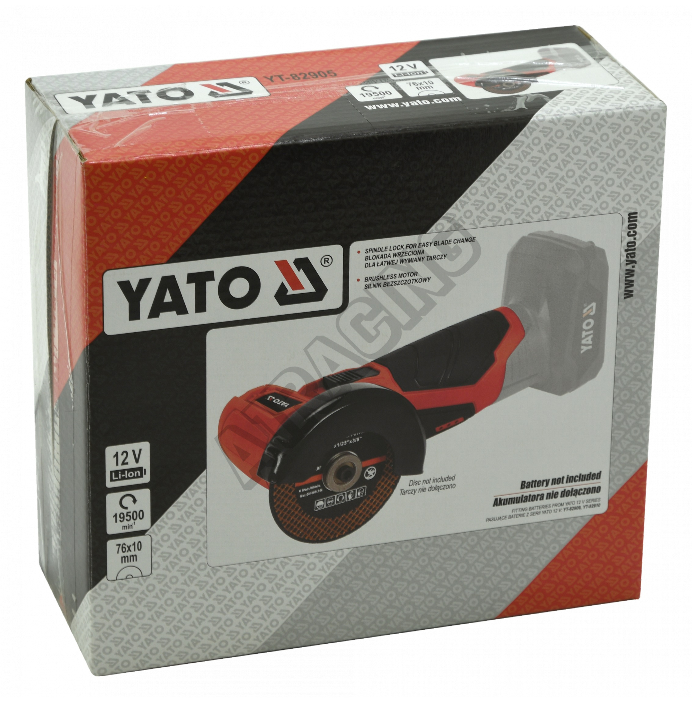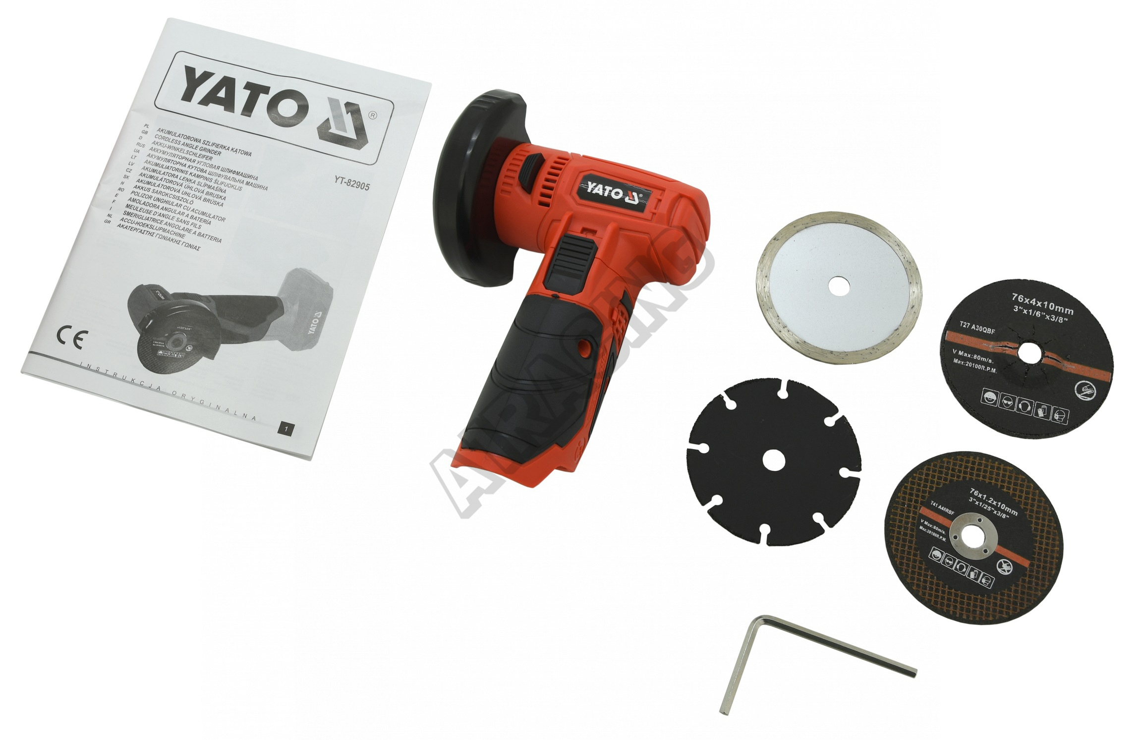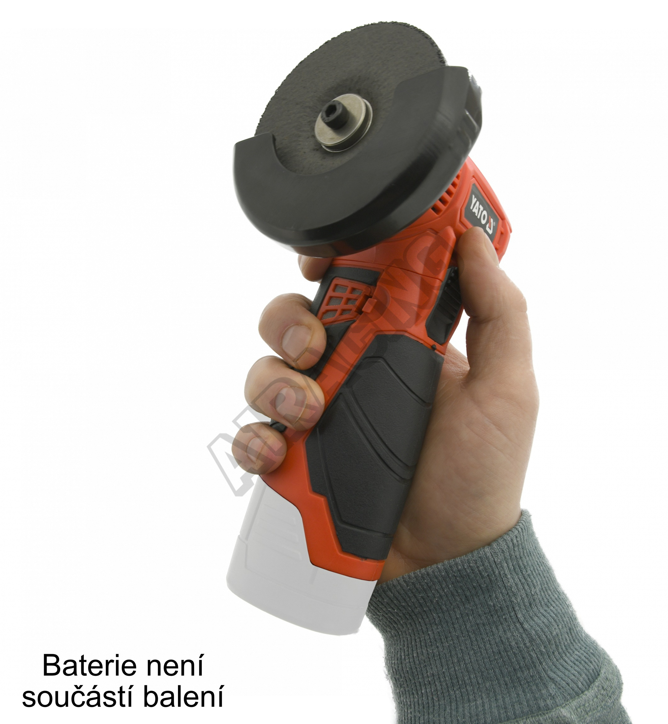 Kompaktní AKU úhlová řezačka značky Yato. Řezačka je vytvořena pro průměr kotouče 76 mm s uchycením