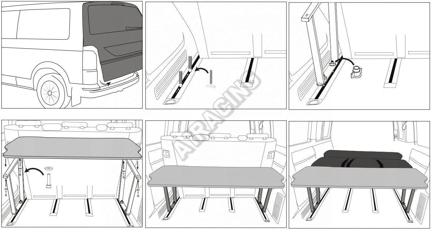 Camping polička je speciálně navržena tak, aby perfektně sedla do kufrového prostoru vozů VW T5 a T6. Díky promyšlenému designu vytváří rovnou a pevnou plochu, která poslouží jako postel pro dva dospělé. Polička se instaluje jednoduše – bez nutnosti trvalých zásahů do vozidla. Složení a rozložení trvá jen několik minut, což ocení každý cestovatel, který chce být rychle připraven ke spánku.