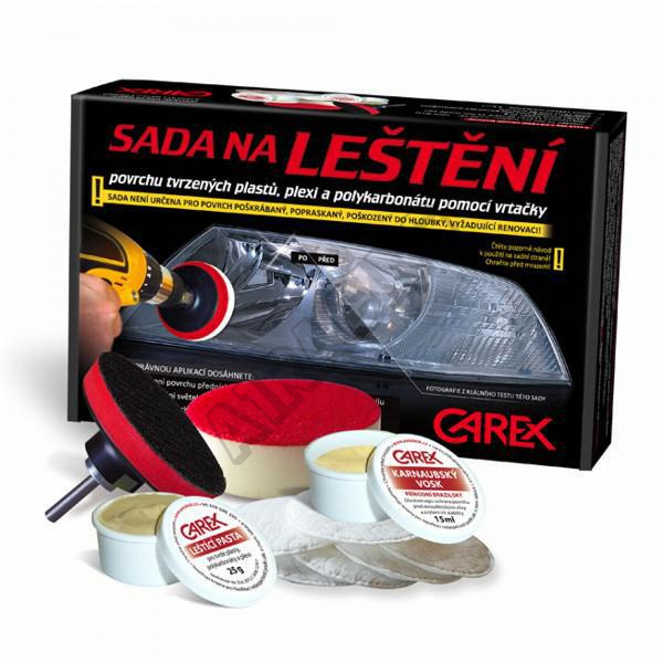 CAREX Sada na leštění světlometů Sada je určená k oživení a ochraně předních a zadních světlometů jednoho automobilu. Popis produktu: sada CAREX na leštění a ochranu povrchu světlometů předních a zadních světlometů jednoho automobilu je sestavená na základě dobrých zkušeností s naší renovační sadou, s rozdílem menšího množství leštící pasty a absence brusných kotoučů. balení je určeno na oživení a ochranu povrchu předních a zadních světel osobního automobilu. přibaleným Karnaubským voskem povrch po renovaci ochráníte před povětrnostními vlivy a zvýšíte jeho UV stabilitu. pro přeleštění světel před a po sezóně a odstranění povrchové oxidace k udržení bezchybného vzhledu světlometu po jeho renovaci potřebujete pouze běžnou či aku vrtačky UPOZORNĚNÍ: tato sada NENÍ určena pro povrch poškozený do hloubky! Pro povrch vyžadující odstranění hlubších vad jejich vybroušením, vybroušení poškozeného krycího laku, povrch poškrábaný nebo popraskaný jsou určeny SADY NA RENOVACI poškozeného povrchu tvrzených plastů CAREX! Obsah balení: UNAŠEČ 75mm (suchý zip) - používá se pro broušení a leštění pomocí kotoučů opatřených suchým zipem klasickými i akumulátorovými vrtačkami. MOLITANOVÝ LEŠTÍCÍ KOTOUČ 85 mm (suchý zip) LEŠTÍCÍ PASTA CAREX 25g PRAVÝ přírodní Brazilský KARNAUBSKÝ VOSK - 15 ml (cca 60 aplikací) JEMNÝ LEŠTÍCÍ APLIKÁTOR 6 KUSŮ TATO SADA JE URČENA PRO zákazníky, kteří se úplné renovace obávají nebo jsou jejich světlomety jsou pouze povrchově zašedlé, zežloutlé, zmatněné, nejsou poškozené do hloubky, nejsou popraskané, ani výrazně poškrábané, proto není potřeba mechanicky narušovat jejich povrch vybroušením vad a stačí je k oživení a navrácení čirosti pouze vyleštit. Využít ji mohou i Ti zákazníci, kteří si před časem světlomety renovovali jakoukoliv renovační sadou a potřebují je jen občas oživit a chránit jejich povrch. CAREX vs. KONKURENCE: Tato naše sada se dá považovat za přímou konkurenci produktu, který již na našem trhu je. Oproti konkurenční sady, která je pro ruční aplikaci, je tato leštící sada CAREX pro použití pomocí vrtačky méně fyzicky a časově náročná, leštění proto zvládne každý. Světlomet stačí umýt, nemusí se demontovat ani olepovat krycí páskou, unašeč se uchytí do vrtačky, na něj se suchým zipem připevní leštící molitan navlhčený pár kapkami vody, prstem se na něj nanese trochu leštící pasty a povrch světlometů se leští až do požadovaného stavu za občasného zvlhčování molitanu nebo přidávání pasty. Po umytí a osušení se na povrch nanese aplikátorem tenký ochranný film karnaubského vosku, který se druhým aplikátorem po 20ti minutách rozleští. Díky strojnímu použití sady je výsledek nesrovnatelný v porovnání s leštěním ručním.