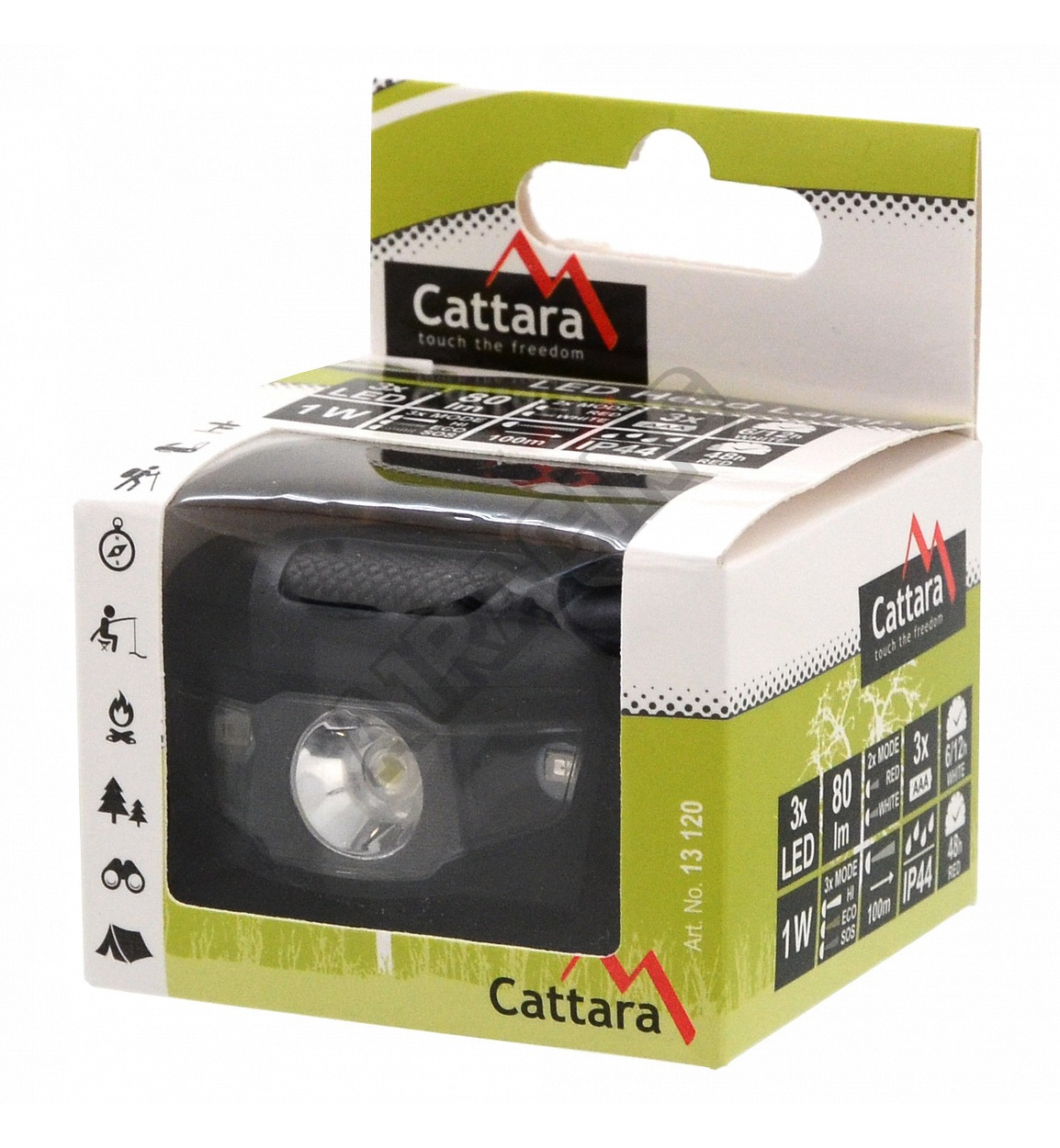 Standardní voděodolná čelovka, osazená třemi LED o výkonu 1 W se svítivostí 80 lm.