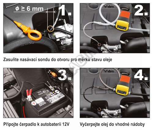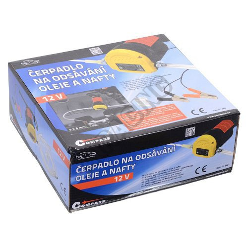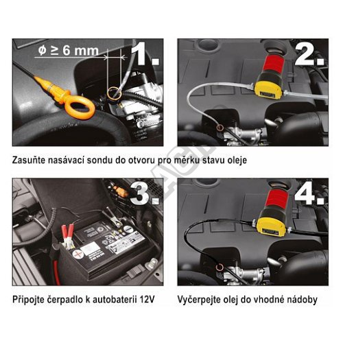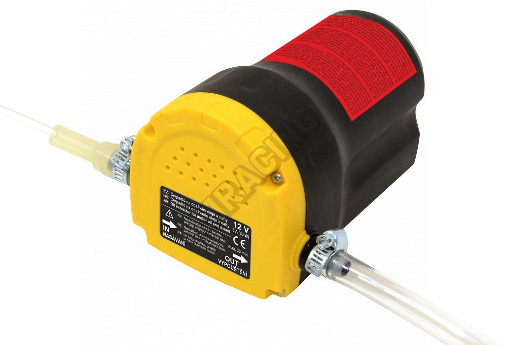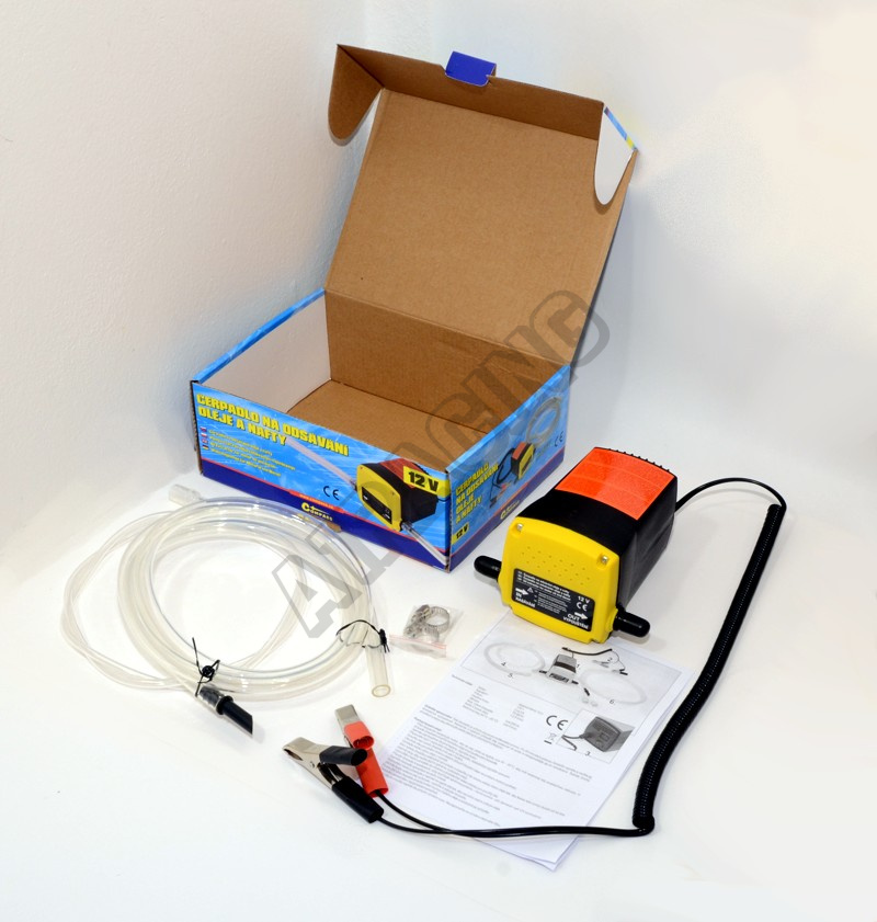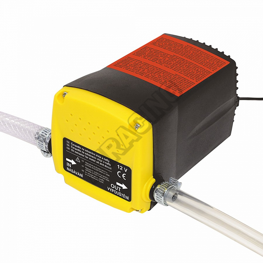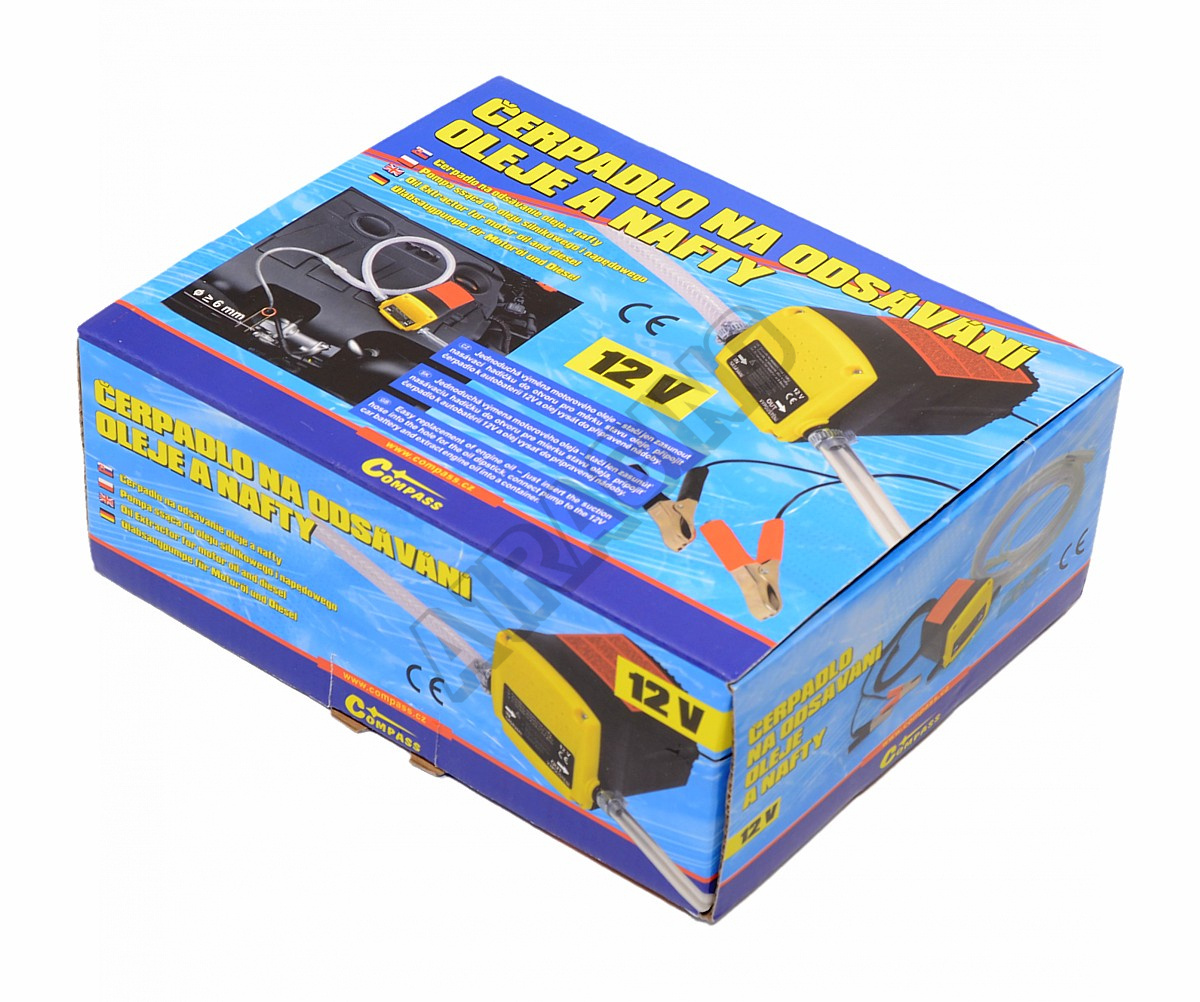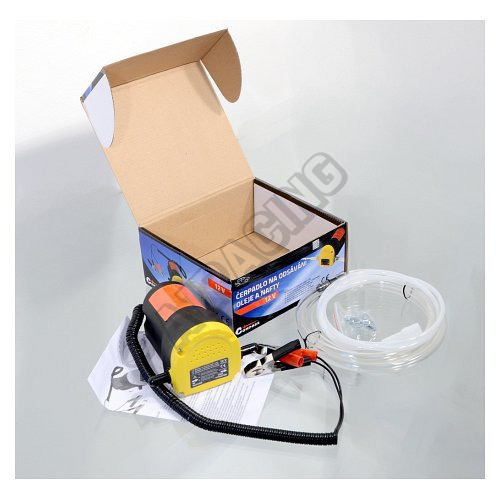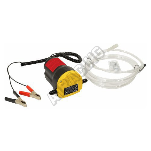 Čerpadlo určené k odsávání oleje, motorové nafty nebo lehkých topných olejů. Napájení 12V pomocí svorek, ideální k připojení na autobaterii 12V. Vhodné pro jednoduchou výměnu motorového oleje. Není nutné hledat vypouštěcí šroub oleje, stačí jen zasunout nasávací sondu do otvoru pro měrku stavu oleje (až do vnitřního průměru 6 mm) a olej vysát do připravené nádoby. Napájení 12V=; příkon 5A; max. výkon čerpadla: 3 l/min.