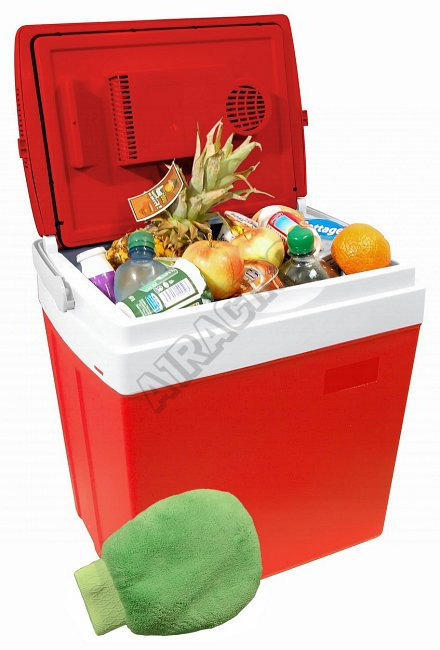 Přenosný chladicí box s možností ohřevu, napájení 12V a 220V, vnitřní objem 30 litrů. Displej s vnitřní teplotou, napájecí kabely uschované v praktické uzavíratelné schránce přímo ve víku chladicího boxu.