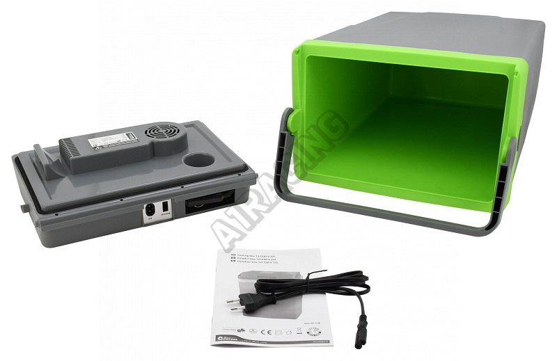 Chladicí box je velmi snadno přenosný, díky rukojeti, která zároveň slouží jako zamykání víka boxu. Napájecí kabel pro 12V je uložen prakticky přímo ve víku boxu. Navíc je k boxu přiložen napájecí kabel pro 230V, takže je možné box napájet prakticky kdekoliv.