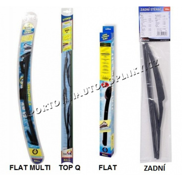 Stěrače FLAT SET (sada 2 ks na celé auto). Vysoce kvalitní pružný člen plochého stěrače zajišťuje stejnoměrný tlak grafitového břitu v celé jeho délce, což zamezuje rozmazávání nečistot a vytváření pruhů.