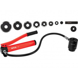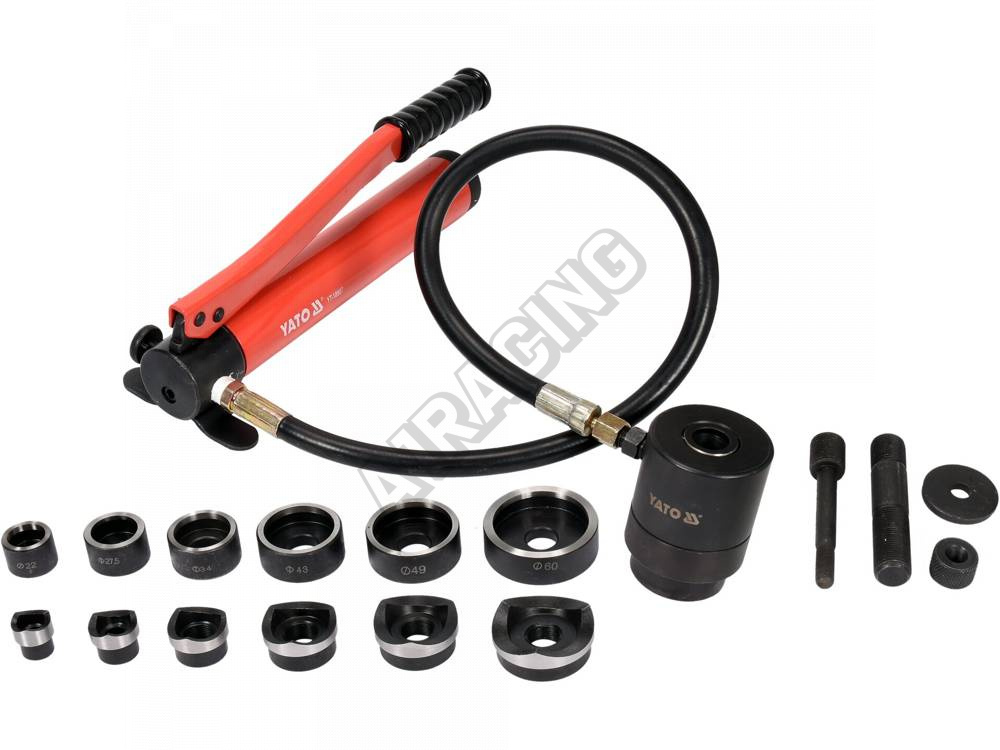 Sada pro vyřezávání kulatých otvorů do plechů v rozmezí průměrů od 22-60 mm. Vysekávací hlava je spojena hadicí s čerpadlem hydraulického válce.