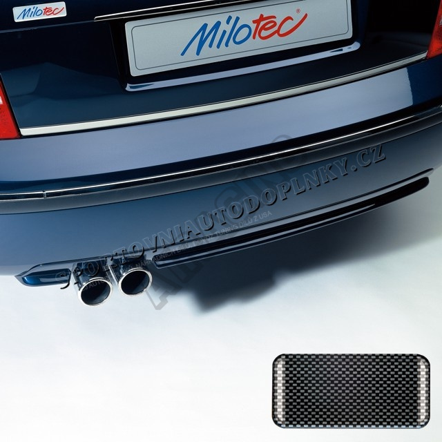 Difuzor zadního nárazníku opticky decentně a nenásilně odliší zadní partie Vašeho vozu. Přiložené foto pouze pro ilustraci (použito vyobrazení lakovaného difuzoru z černého ABS). Difuzor je vyroben z ABS v karbonovém designu, který imituje ultralehký a velice pevný materiál karbon s matricí uhlíkových vláken, často používaný v automobilovém sportu. Po odstranění krycí ochranné fólie z povrchu difuzoru a po úpravě zadního nárazníku (otvor pro dvojitou koncovku výfuku) je možné difuzor ihned přilepit. Dvojitá koncovka výfuku je vyrobena z ušlechtilé nerezavějící oceli.