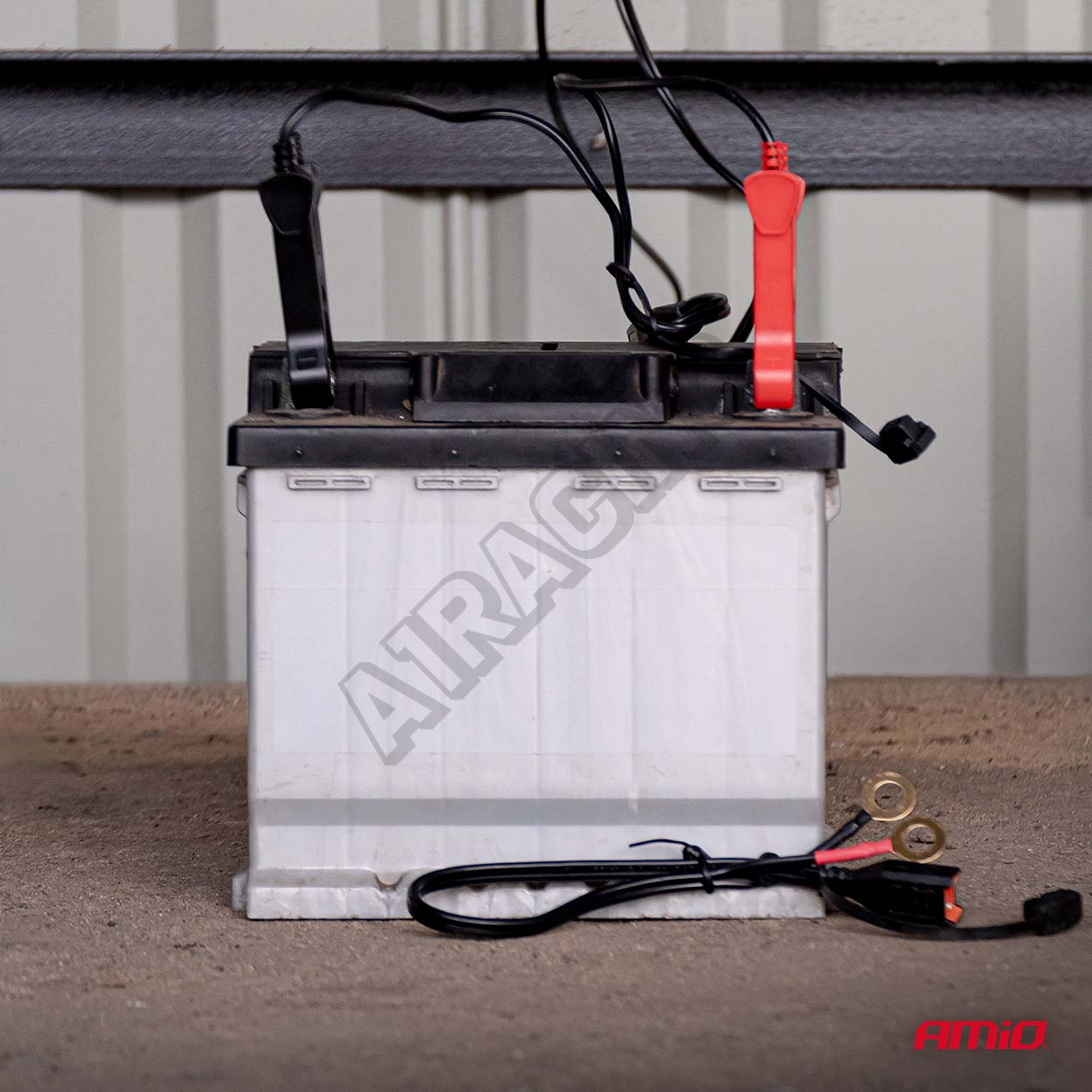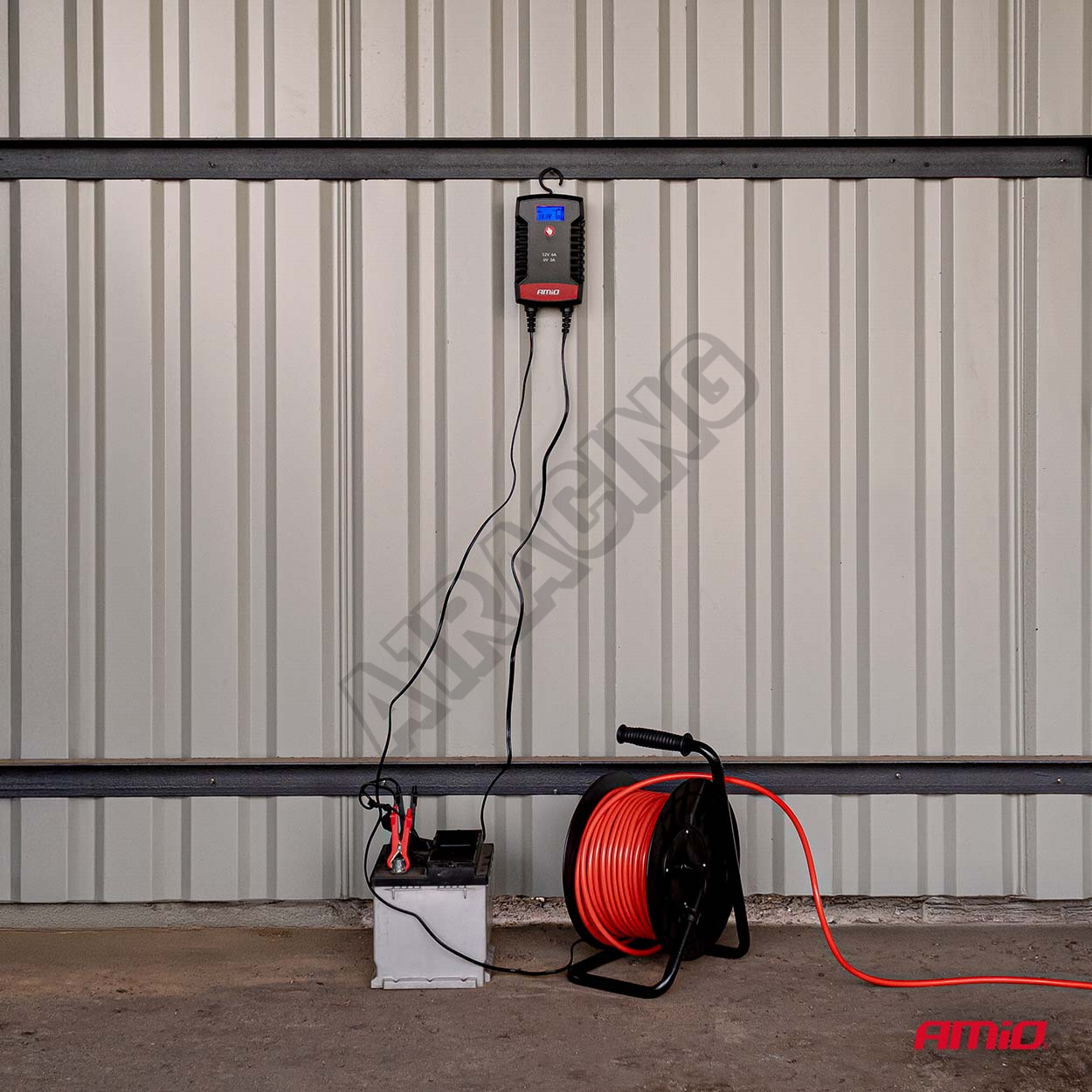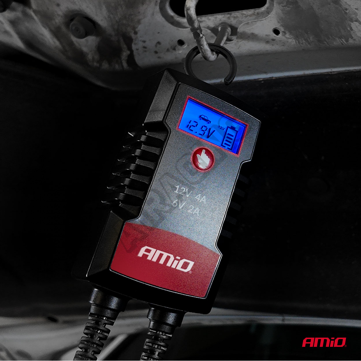 Digitální nabíječka AMiO PRO HOOK je moderní a pohodlné zařízení pro nabíjení baterií AGM, GEL a LiFePo4 (LFP). Díky maximálnímu nabíjecímu proudu 4 A a podpoře napětí 6V a 12V, zajišťuje rychlé, bezpečné a efektivní nabíjení baterií v osobních automobilech, motocyklech, lodích či skladovacích zařízeních. Nabíječka s funkcí udržování napětí s vestavěným hákem pro zavěšení pod kapotou. Obsahuje rychlospojku a další očkové konektory v sadě. Optimální pro nabíjení motocyklových a benzínových automobilových baterií, navíc má dedikovanou funkci nabíjení LFP baterií.