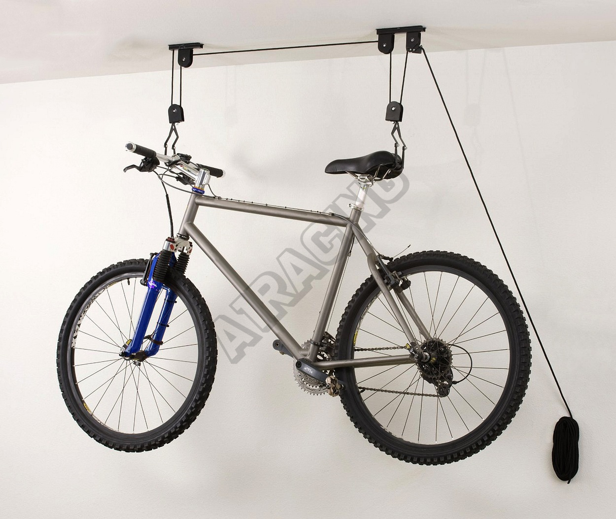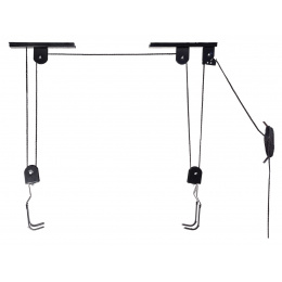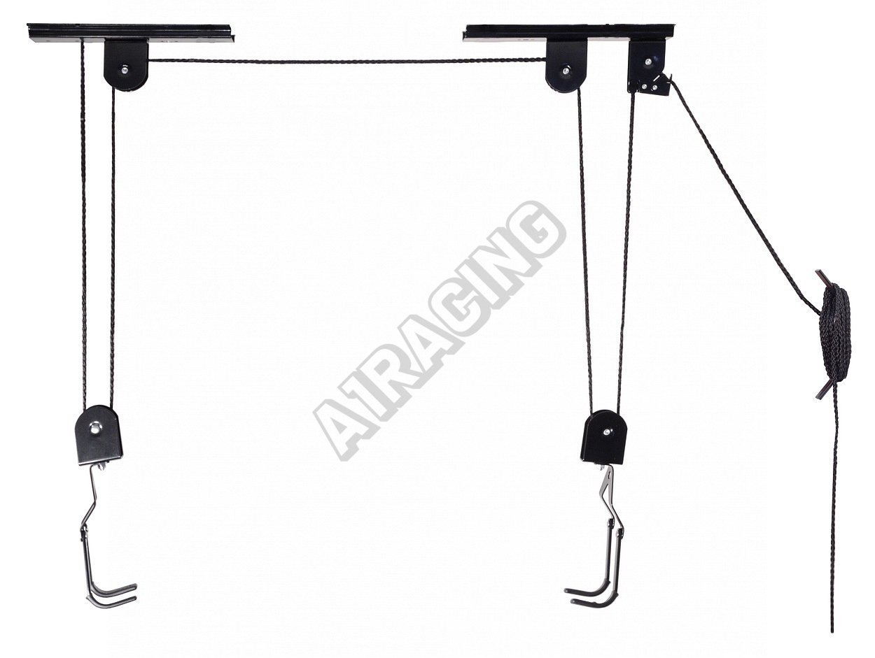 Držák funguje na principu kladkostroje a dokáže snadno zvednout jízdní kolo až do váhy 20 kg a umístit jej pod strop místnosti s maximální výškou 4 m.