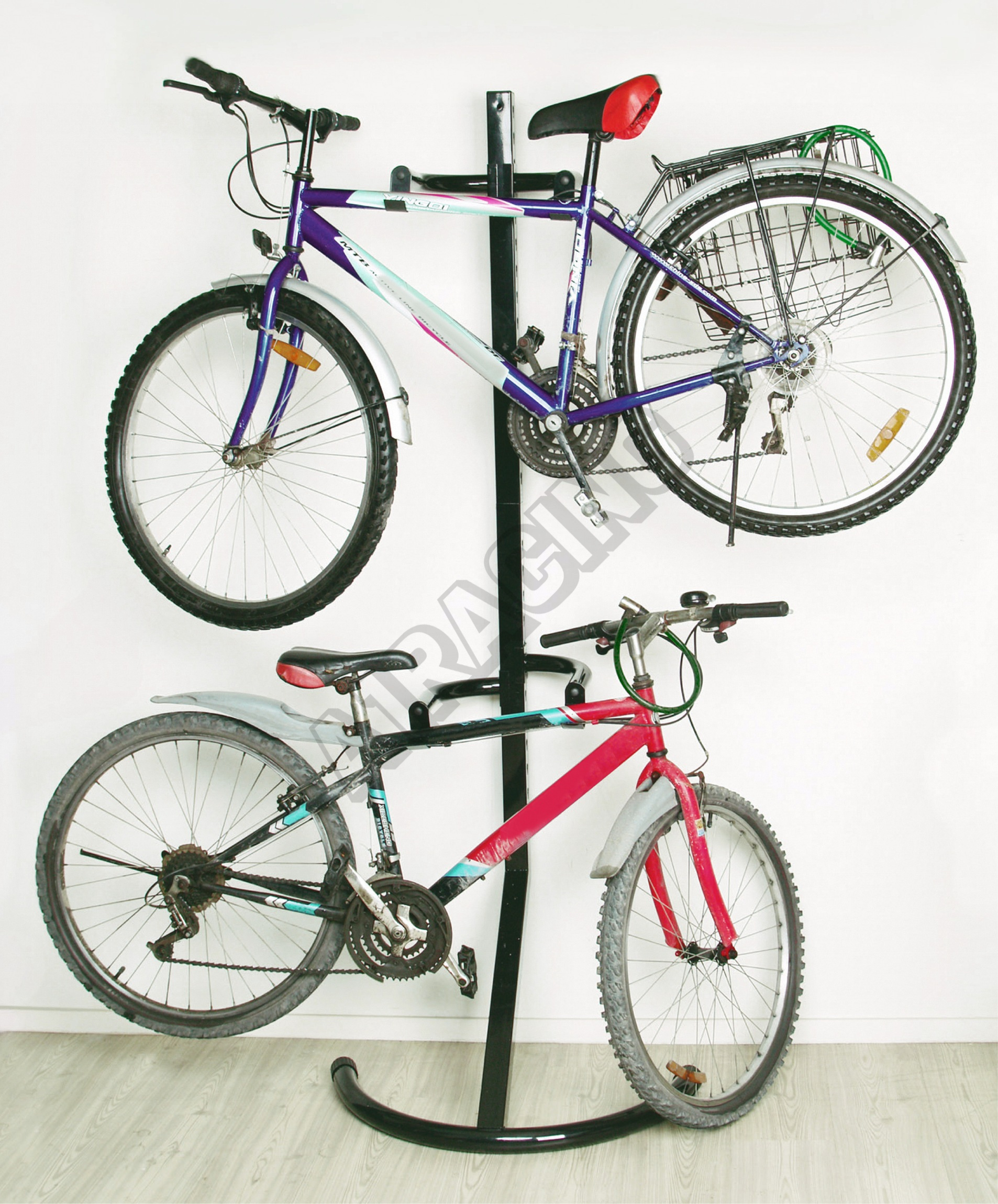 Praktický držák pro 2 bicykly, vhodný zejména pro dlouhodobé uskladnění a úsporu místa.