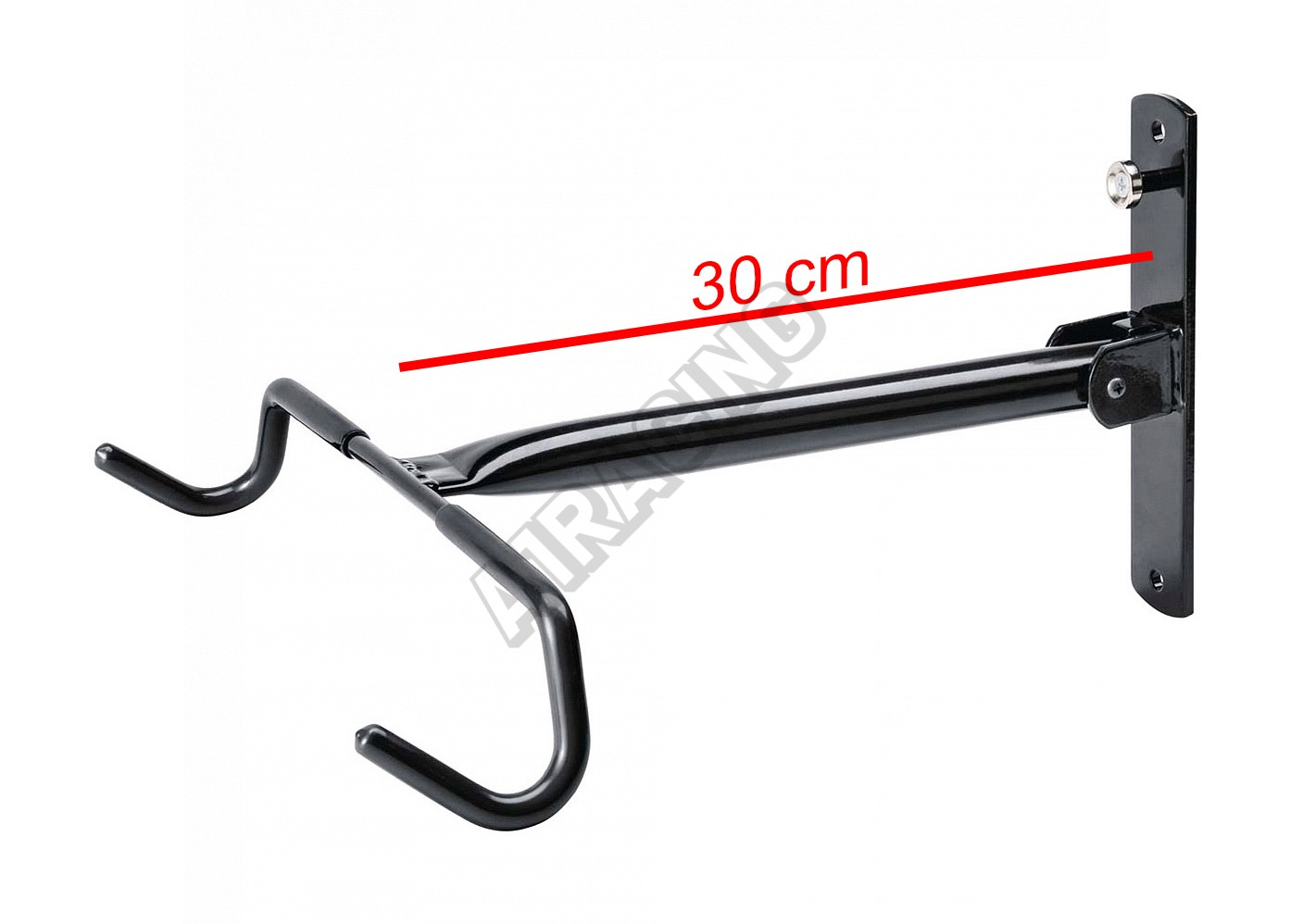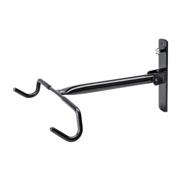 Sklápěcí kovový držák jízdního kola určený k montáži na stěnu. Držák je tvarován pro zavěšení za rá