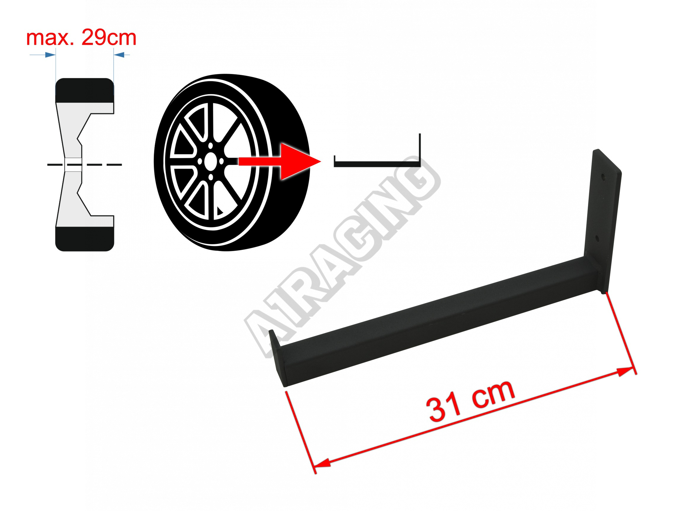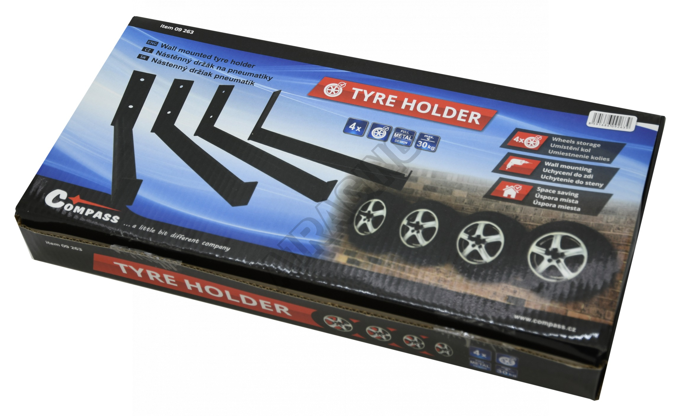 Ocelové držáky mají nosnost 30kg (jeden držák) a jsou uzpůsobeny pro umístění disků s pneumatikou, s maximální šířkou 29 cm. Disk se na držák umísťuje za středový otvor. Pro zamezení poškrábání disků jsou součástí balení samolepící pěnové chrániče.