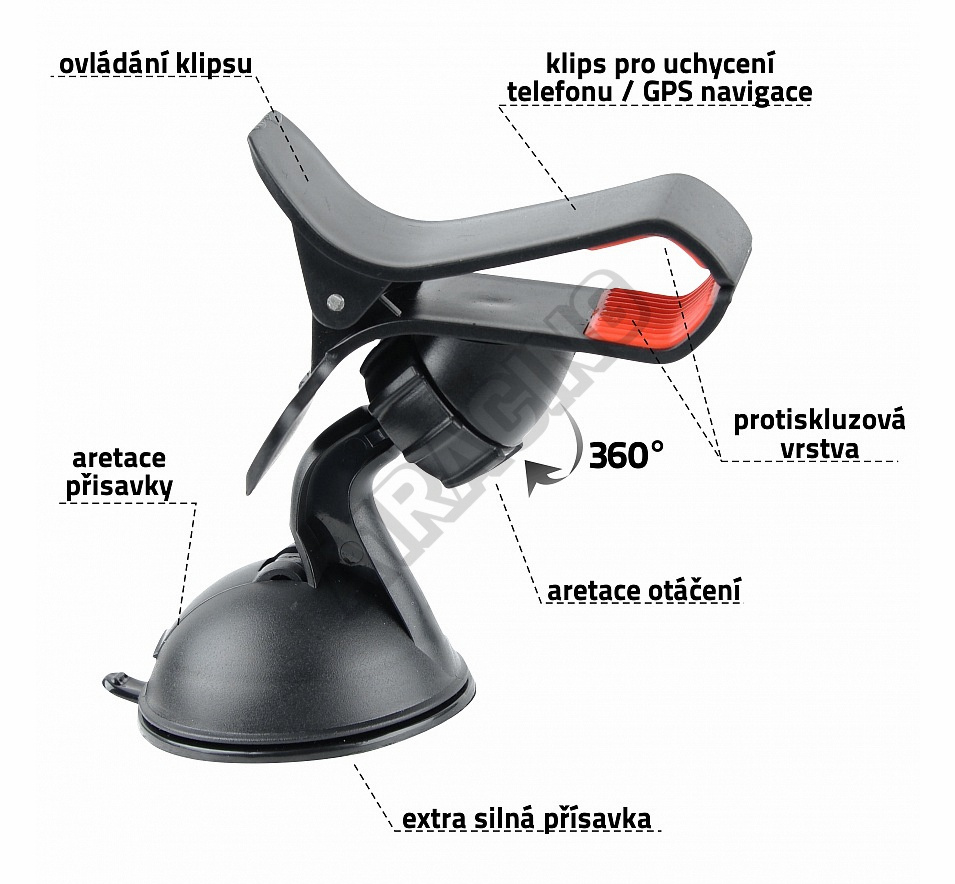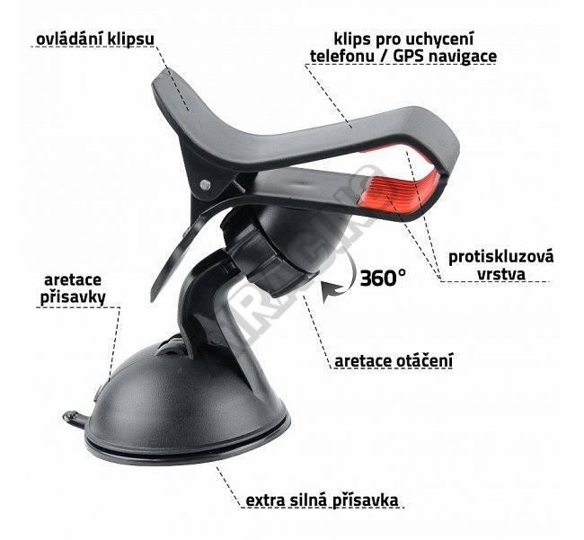Držák telefonu / GPS clips na přísavku Držák telefonu s extra silnou přísavkou a klipsem pro uchy