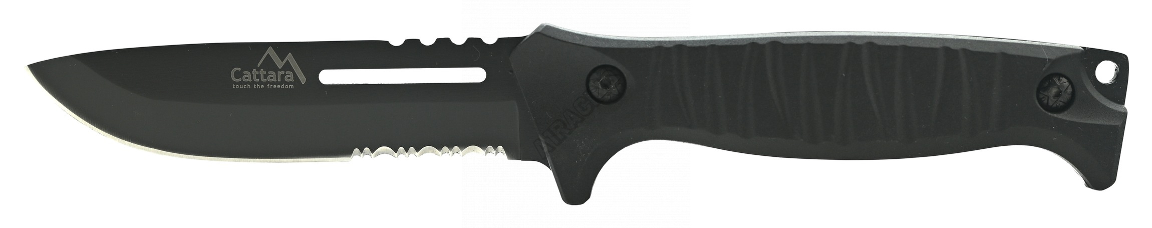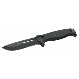 Rukojeť je osazena ergonomicky tvarovanými střenkami černé barvy, nůž perfektně padne do ruky a je opatřen zarážkou chránící nositele před pořezáním.
