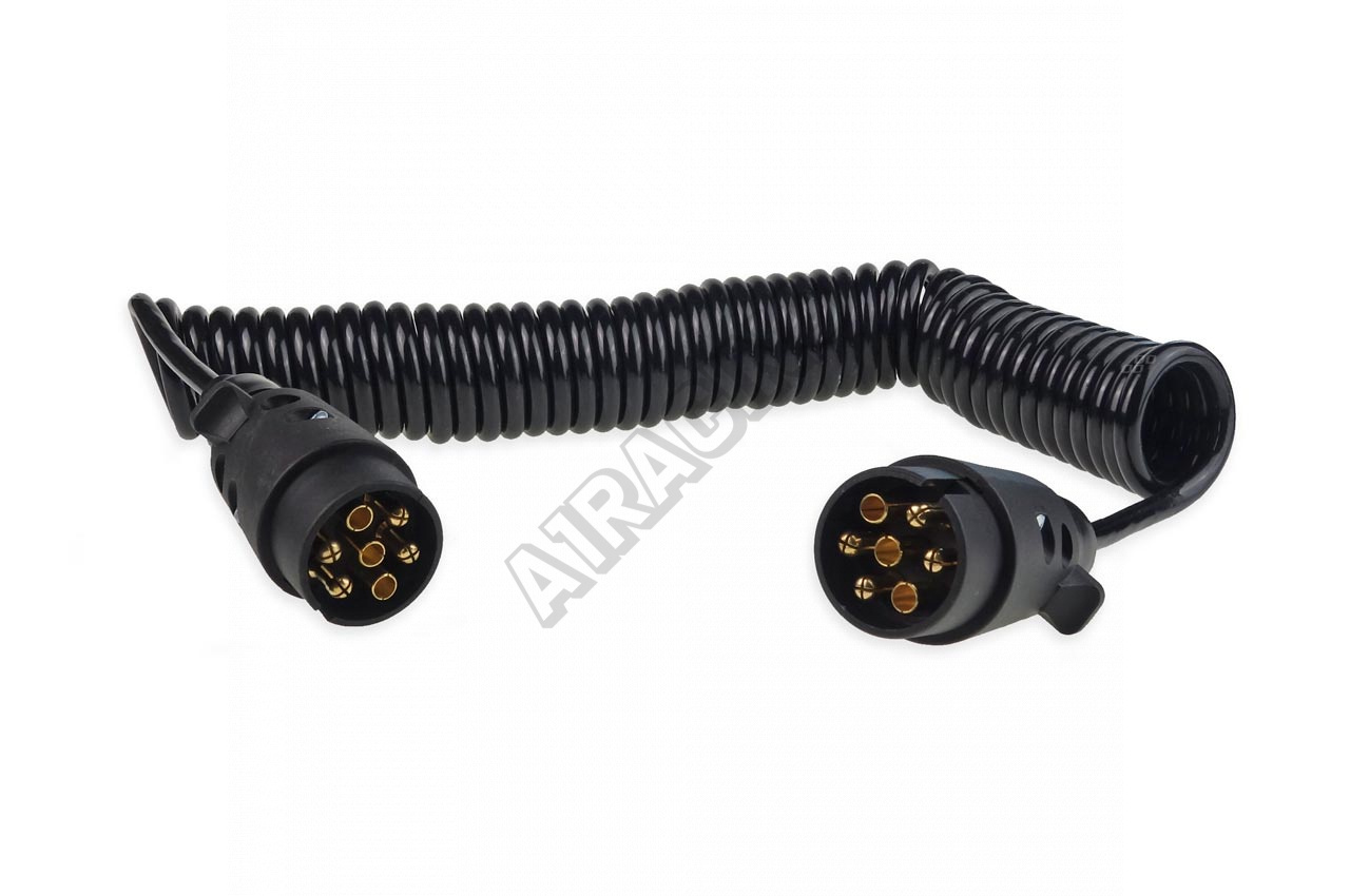 Spirálový kabel 7pinový. Zajistí dobré spojení, protože díky spirálovému tvaru jej lze natáhnout do délky přibližně 6 m. Na obou koncích se nachází plastová zástrčka 7PIN. TECHNICKÉ PARAMETRY: Materiál: PVC Napájení: 12 V Délka po roztažení 6 m 2x koncovka 7-pólová