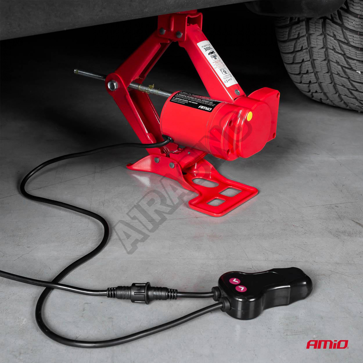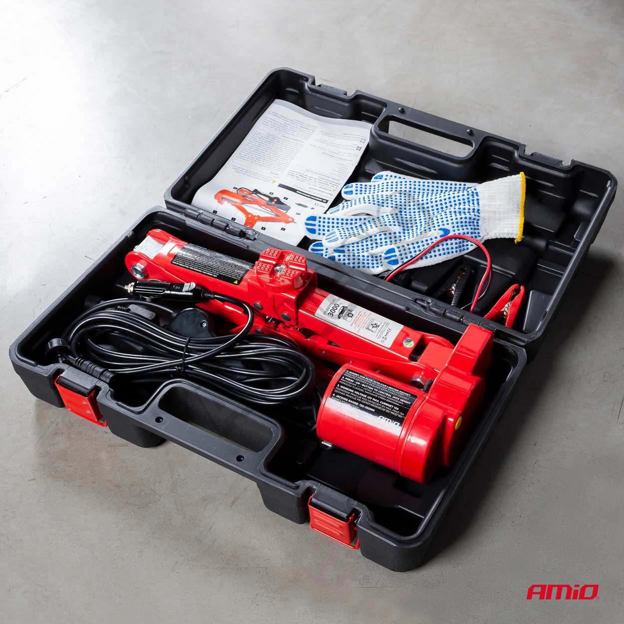 Balení obsahuje: zvedák + el. ovládání, adaptér do zapalovače, adaptér pro baterie, rukavice, manuál, plastový kufr