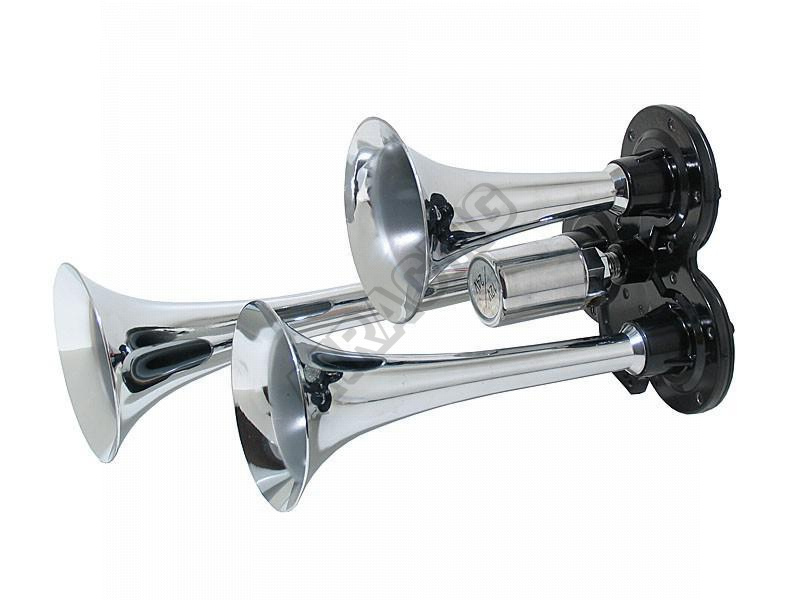 Fanfára - chrom 3 trubky 12V/ 24V - vzduchová fanfára s elektromagnetickým ventilem 12/24V Nutno z