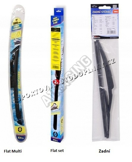 Stěrače FLAT SET (sada 2 ks na celé auto). Vysoce kvalitní pružný člen plochého stěrače zajišťuje stejnoměrný tlak grafitového břitu v celé jeho délce, což zamezuje rozmazávání nečistot a vytváření pruhů.