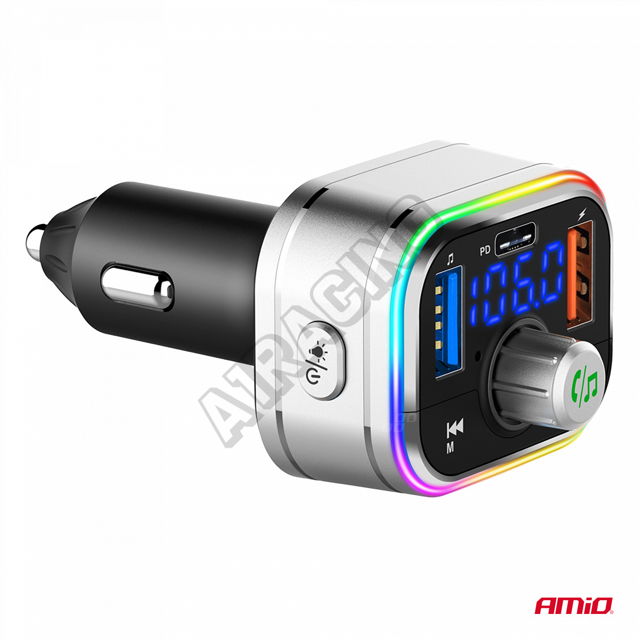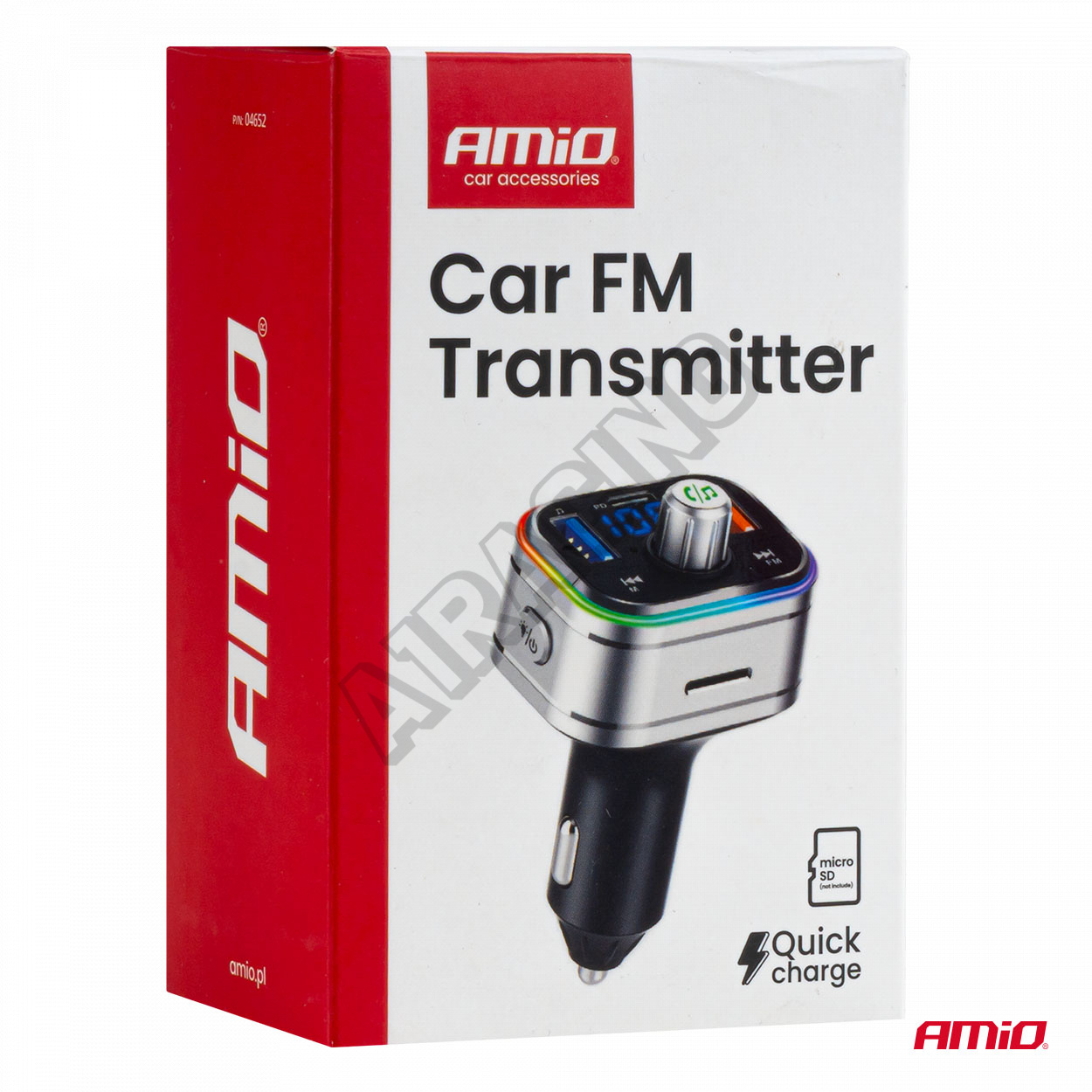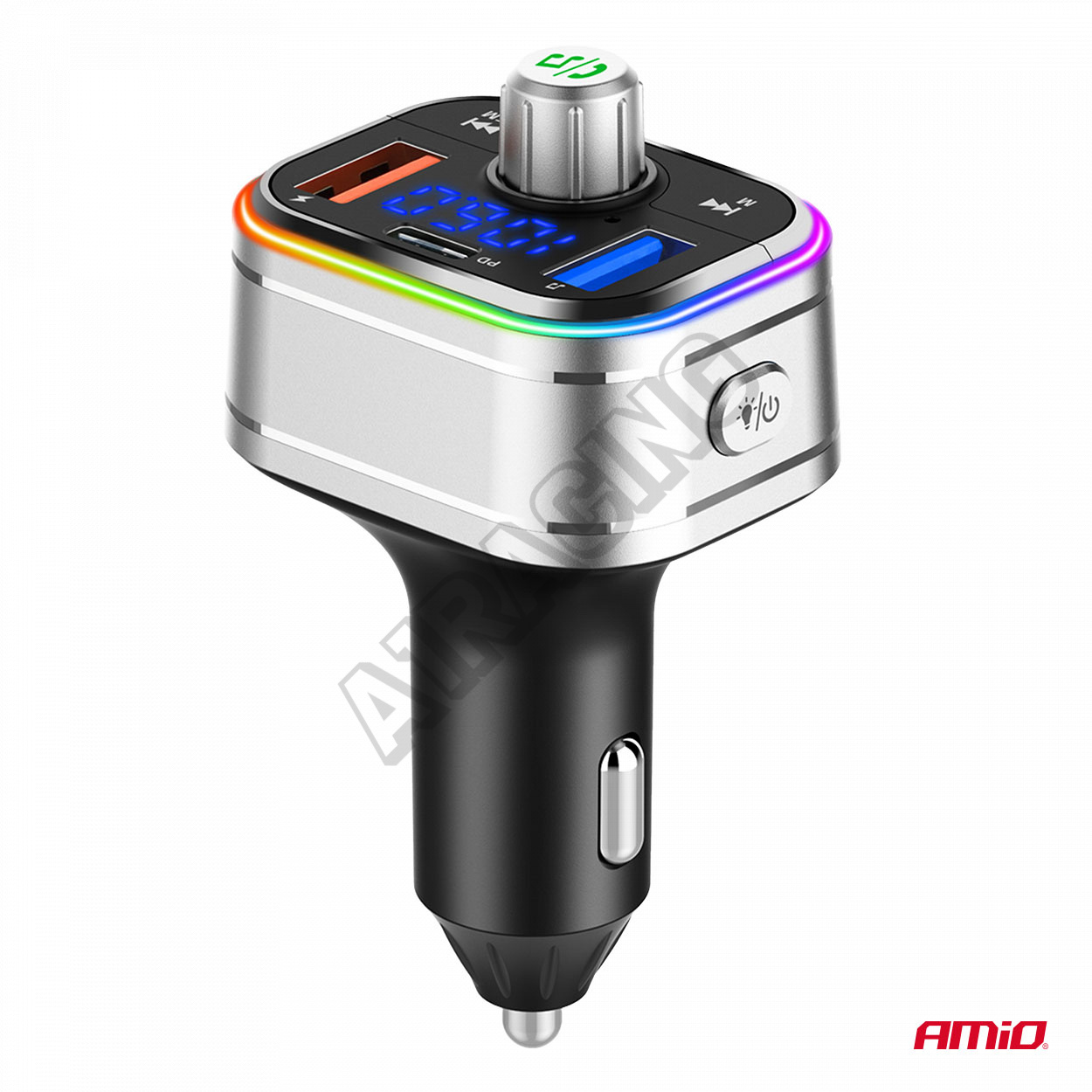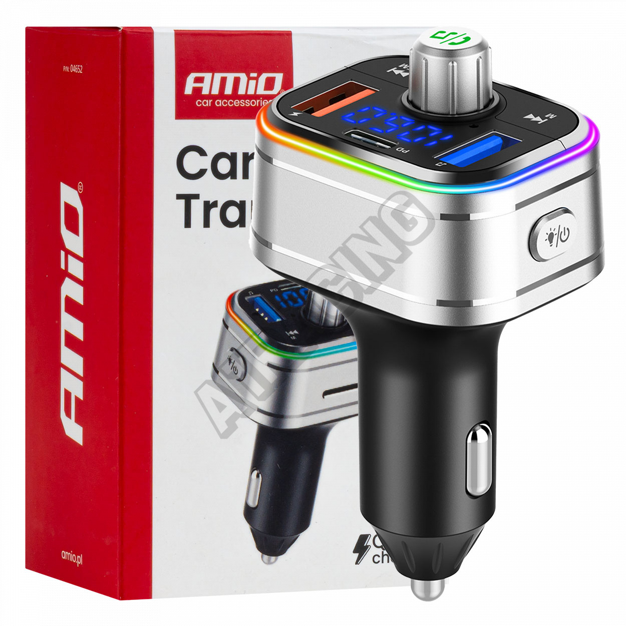 FM vysílač do auta 2×USB-A 1×USB-C microSD 12V 24V AMIO-04652