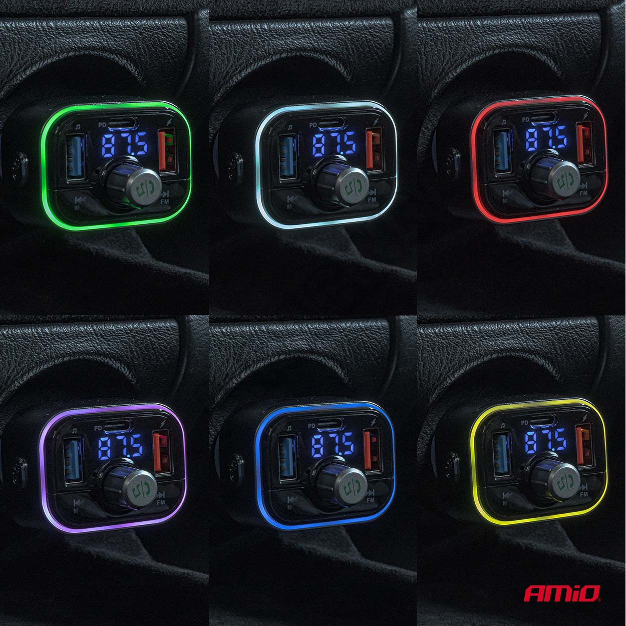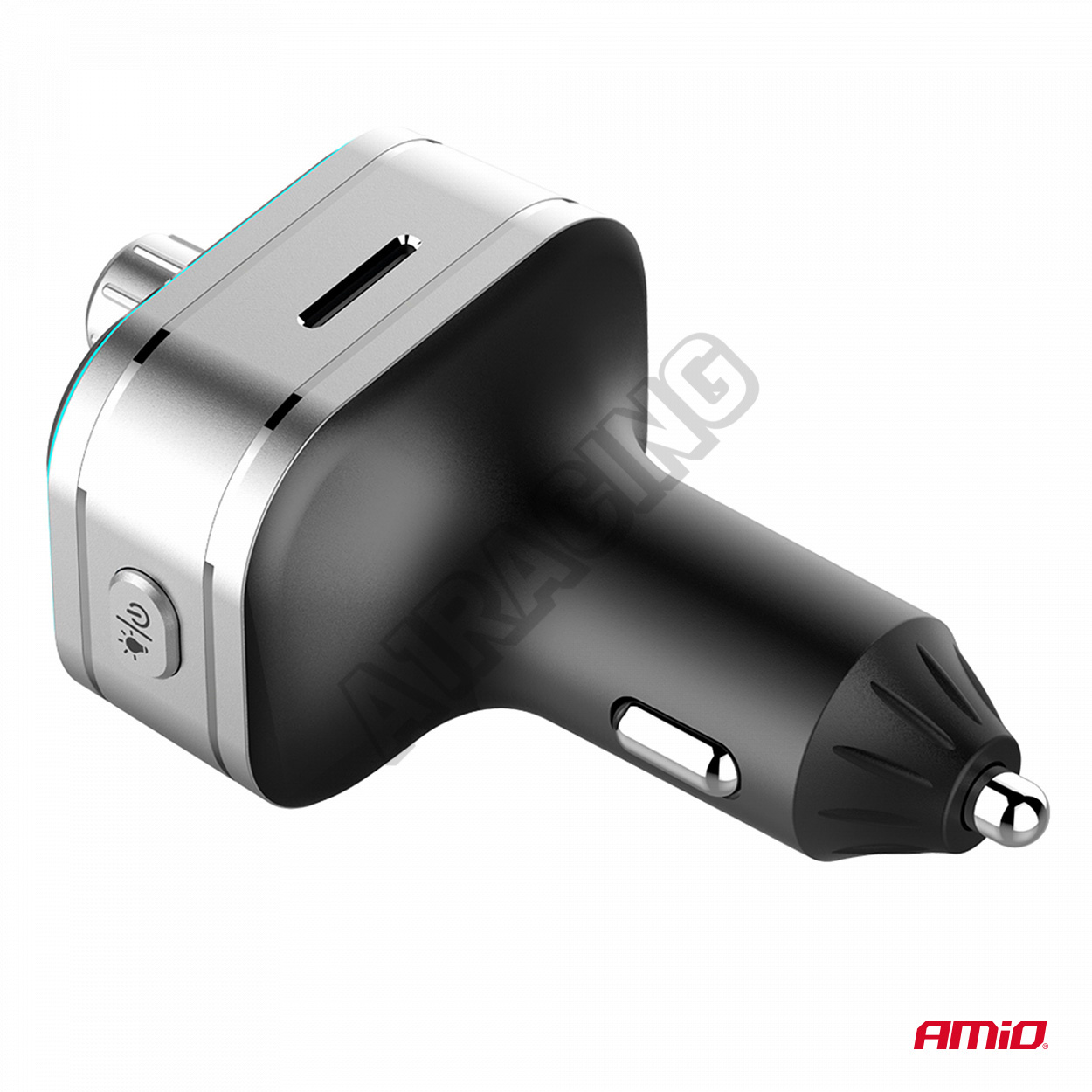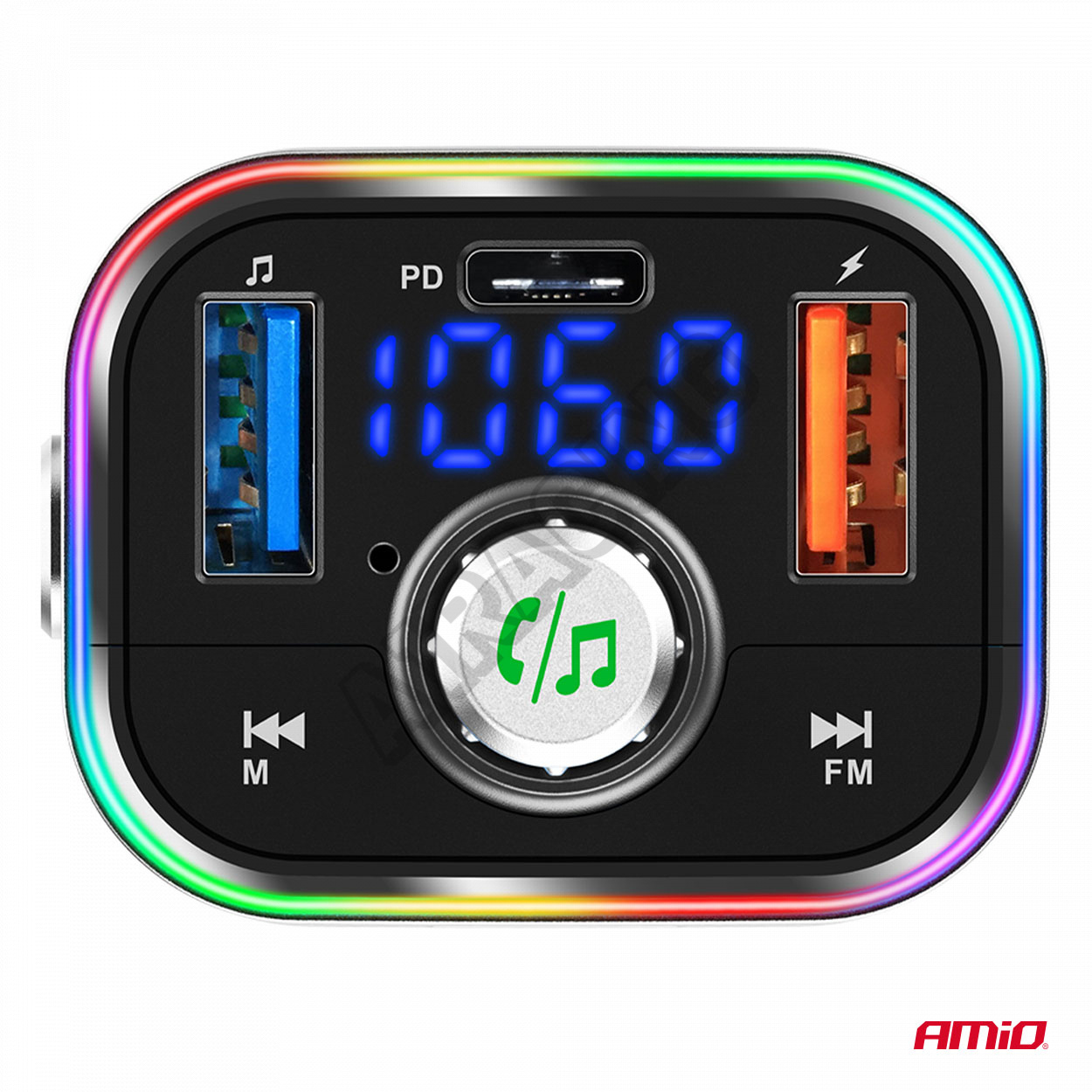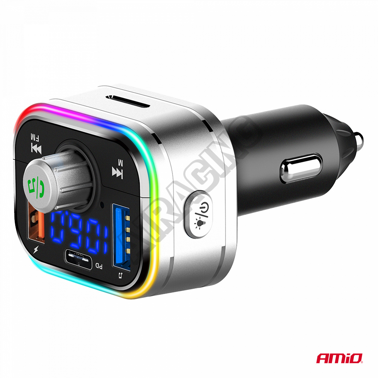 FM vysílač do auta 2×USB-A 1×USB-C microSD 12V 24V AMIO-04652