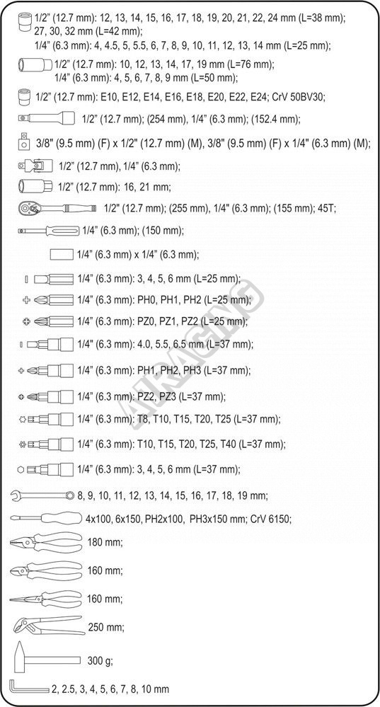 | 12x | klíč očkoplochý: 8; 9; 10; 11; 12; 13; 14; 15; 16; 17; 18; 19 mm |