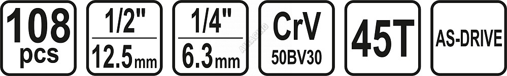 Sada obsahuje dvě ráčny, celou řadu bitů, adaptérů, nástavců 1/2"a 1/4" vše uspořádáno v přehledných pozicích.