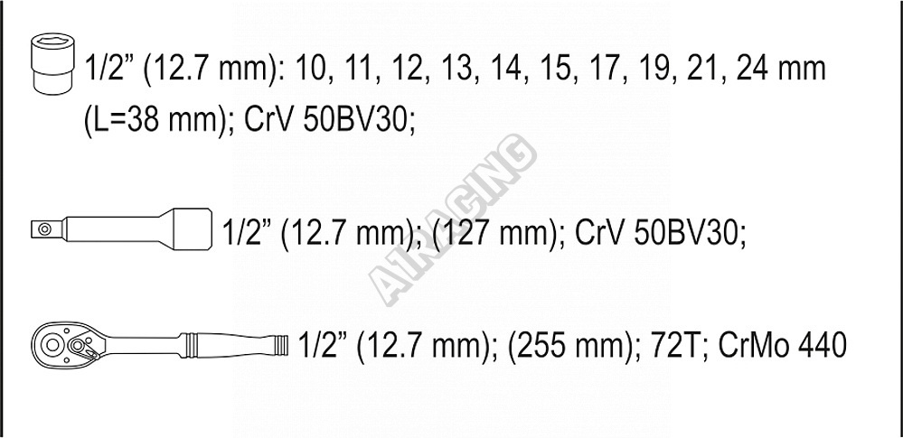| 10x | nástavec 1/2": 10; 11; 12; 13; 14; 15; 17; 19; 21; 24 mm, (38 mm) |