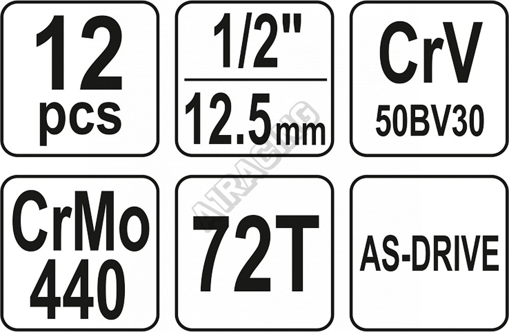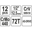 Gola sada 1/2" obsahuje 12ks: nástavců, prodlužovací nástavec a ráčnu s plastovou rukojetí. Vyrobené z kvalitní chromvanadiové oceli CrV6140 a CrV50BV30, S2 s funkcí AS-DRIVE.
