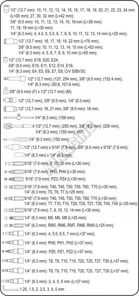 Sada obsahuje tři ráčny, celou řadu bitů, adaptérů a nástavců, vše přehledně uspořádáno v přehledných pozicích.