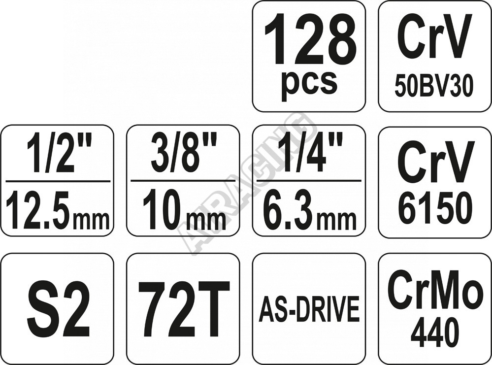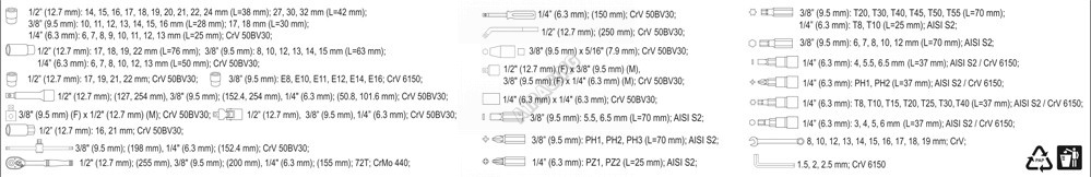 Gola sada 1/2", 3/8", 1/4" obsahuje 128ks: nástavců, prodlužovacích nástavců, ráčny s plastovou rukojetí, kloubové nástavce očkoploché klíče a další příslušenství. Vyrobené z kvalitní chromvanadiové oceli CrV6140 a CrV50BV30, S2 s funkcí AS-DRIVE.