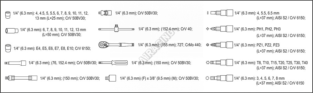 | 12x | nástavec 1/4": 4; 4.5; 5; 5.5; 6; 7; 8; 9; 10; 11; 12, 13 mm (L= 25 mm) |