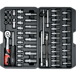 Gola sada 1/4" obsahuje 56ks: nástavců, prodlužovacích nástavců, ráčnu s plastovou rukojetí a další