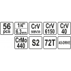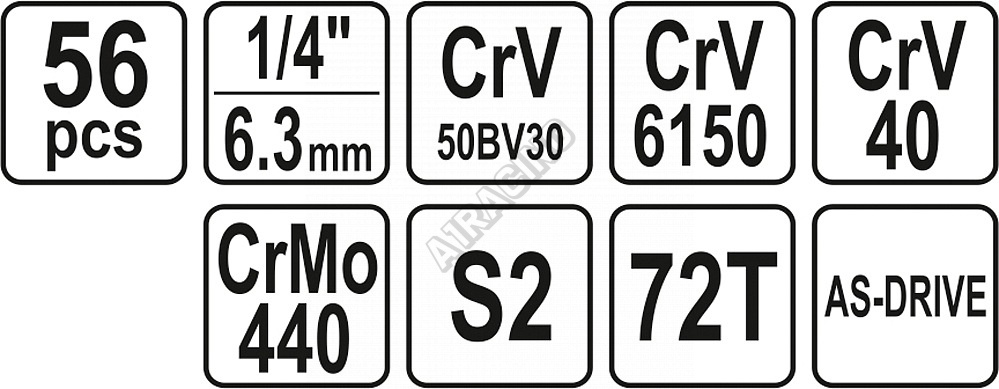 Gola sada 1/4" obsahuje 56ks: nástavců, prodlužovacích nástavců, ráčnu s plastovou rukojetí a další příslušenství. Vyrobené z kvalitní oceli CrV50BV30, CrV40, CrV6150, CrMo440 a S2 s funkcí AS-DRIVE. Ráčna má jemný 72 zubý chod.