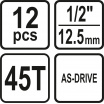 Gola sada 1/2" obsahuje 12ks: nástavce a ráčnu s plastovou rukojetí. Vyrobené z kvalitní oceli s funkcí AS-DRIVE.