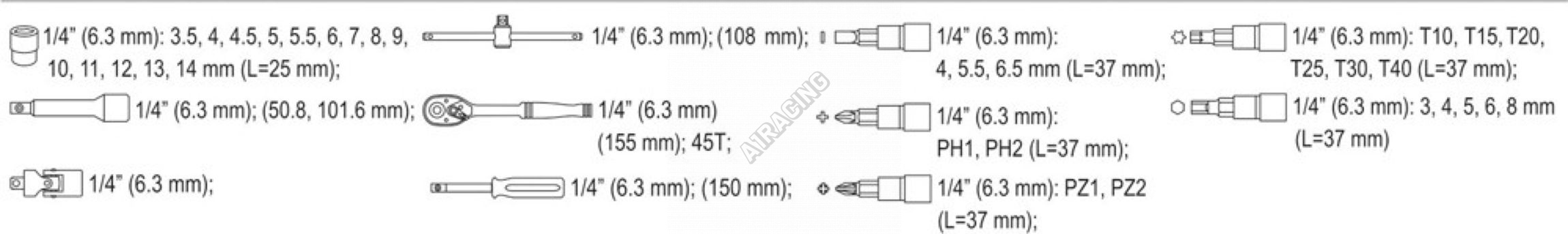 - 14x nástavec 1/4": 3,5; 4; 4,5; 5; 5,5; 6; 7; 8; 9; 10; 11; 12; 13; 14 mm (25 mm)
