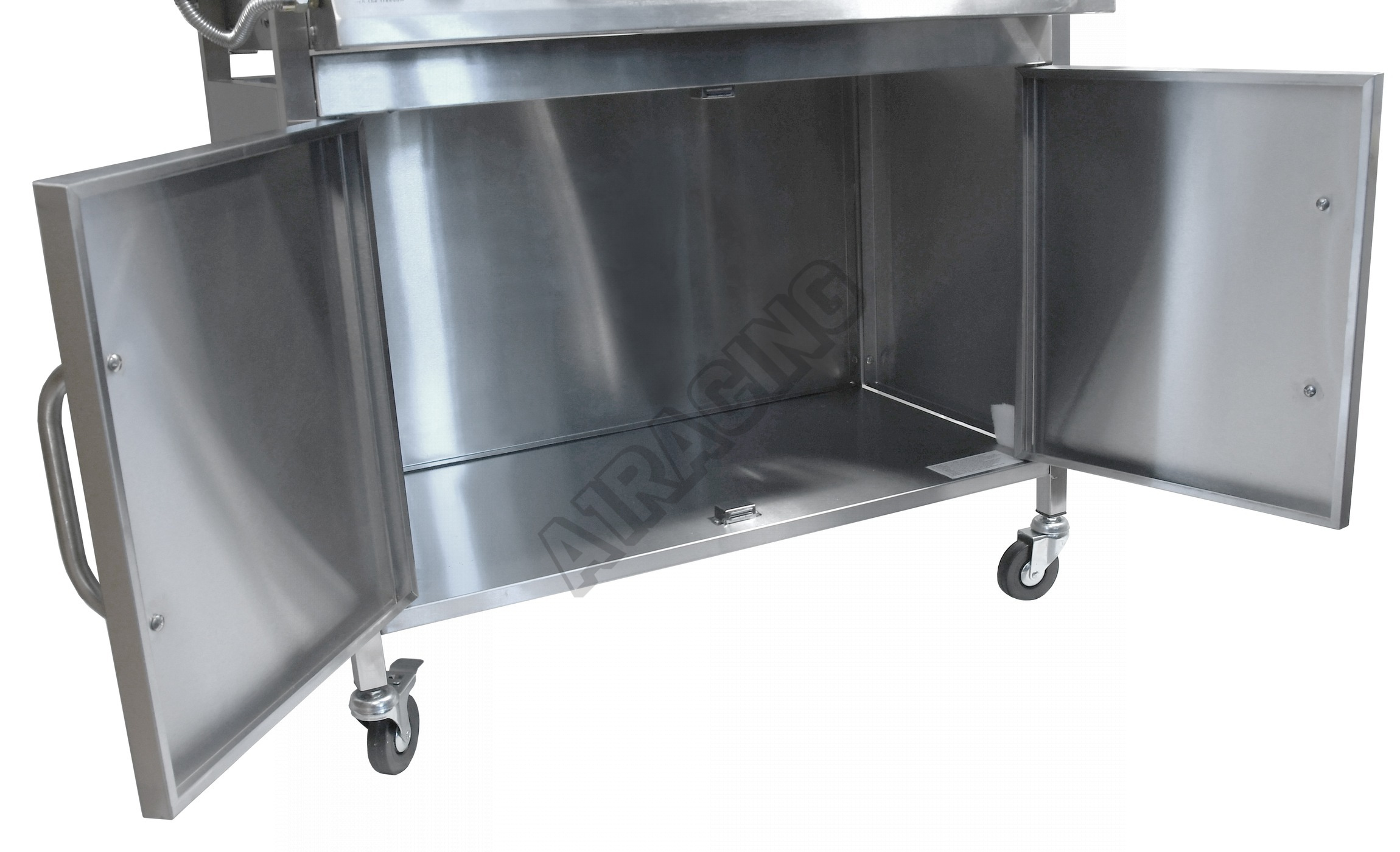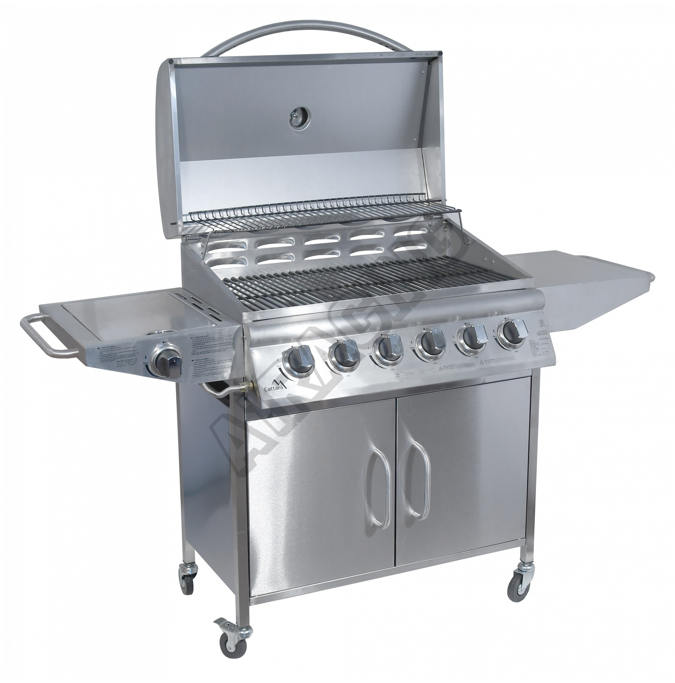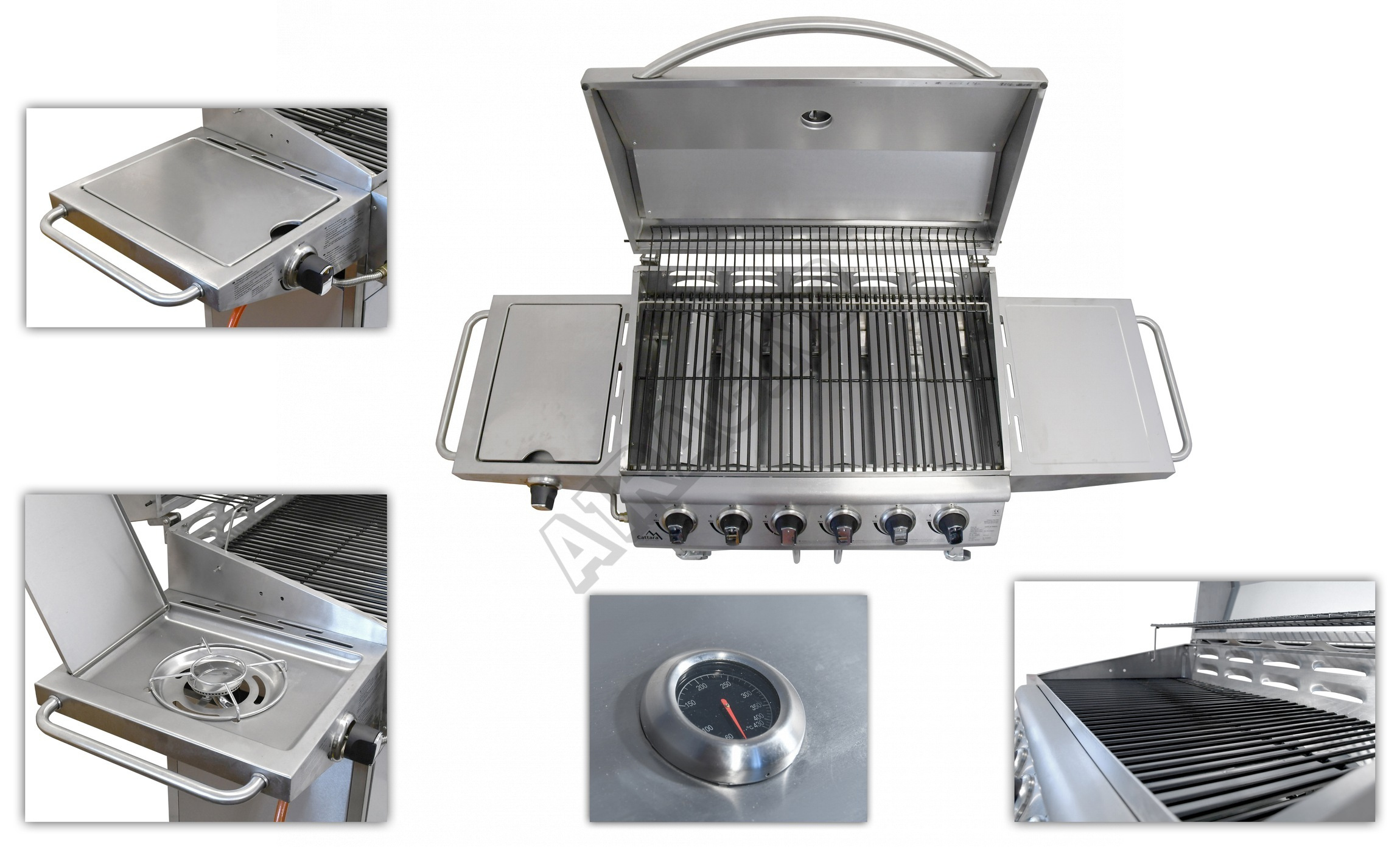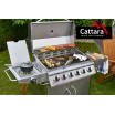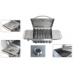 Gril je pojízdný (4 kolečka z toho 2 bržděná), osazen sklopným víkem s teploměrem a odkládací poličkou na příslušenství. Dále byl doplněn bočním vařičem se samostatnou regulací a piezo zapalováním. Ve střední části je objemná, uzavíratelná skříňka s dvířky. Součástí je i spojovací hadice k plynové lahvi a redukční ventil.