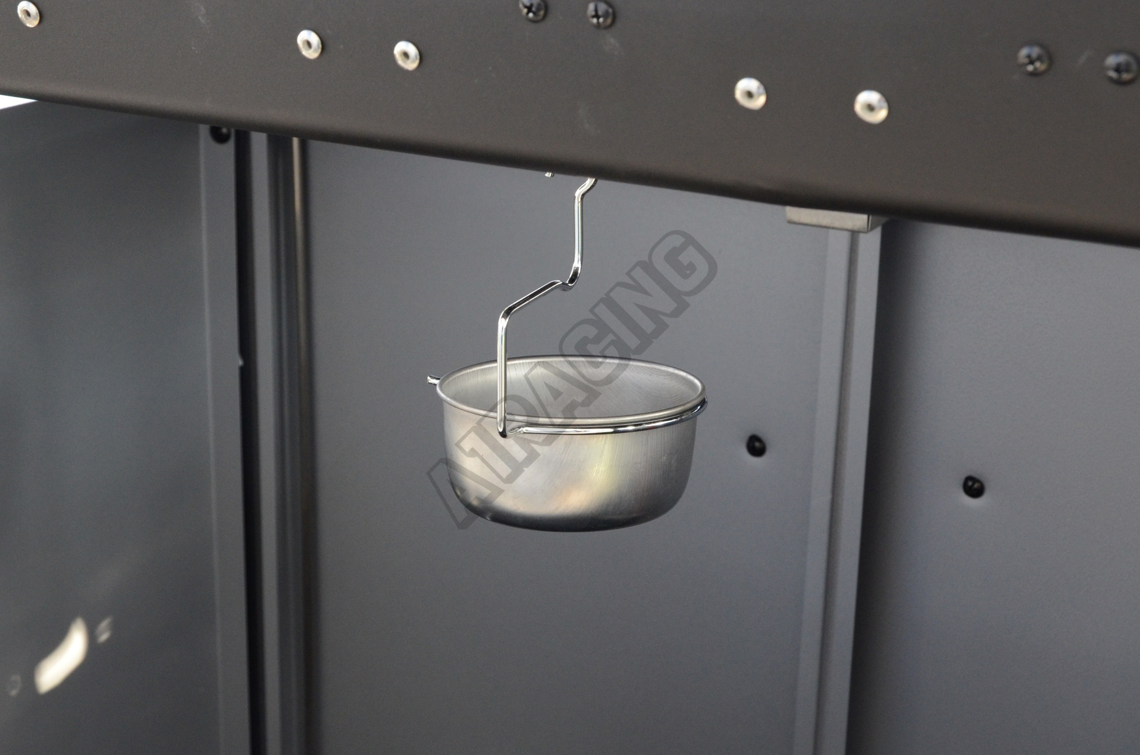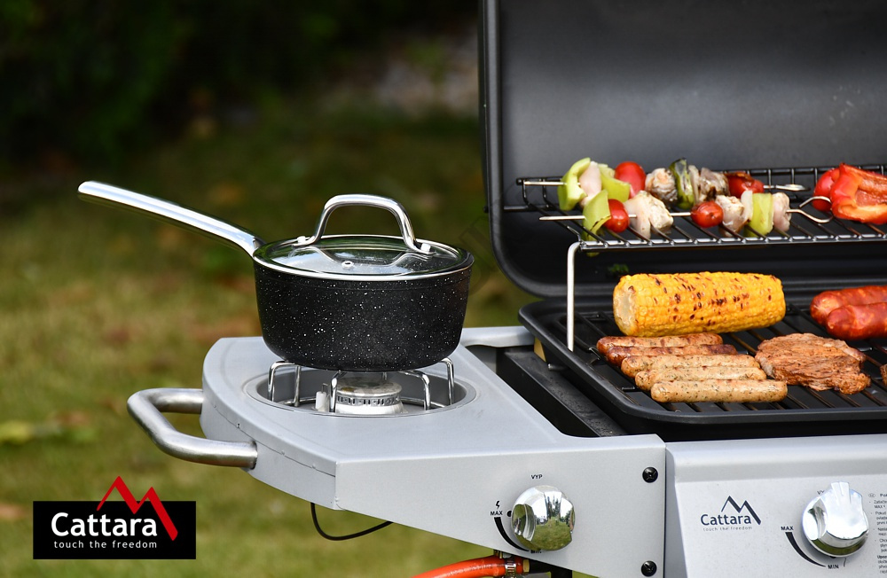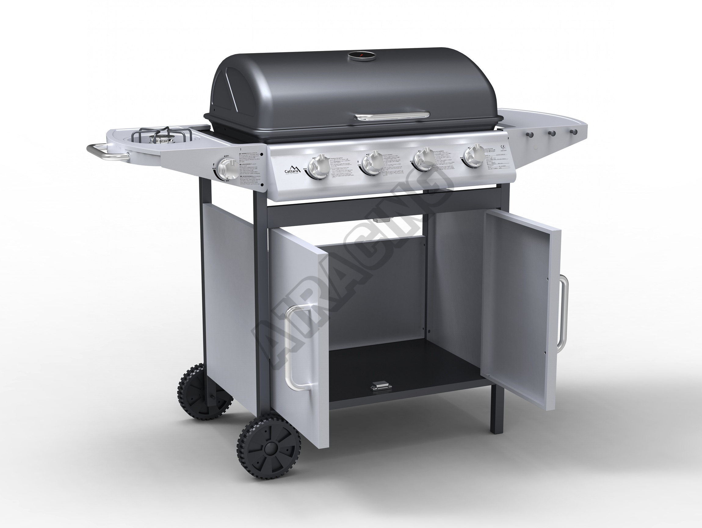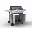 Gril je pojízdný (2 kolečka), je vybaven sklopným víkem s teploměrem a odkládacími poličkami s háky na příslušenství. Dále je vybaven přídavným bočním vařičem se samostatnou regulací a piezo zapalováním. Ve střední části je uzavíratelná skříňka s dvířky. Součástí je i spojovací hadice k plynové lahvi a redukční ventil. Díky sklopné boční poličce se gril snadno skladuje.