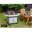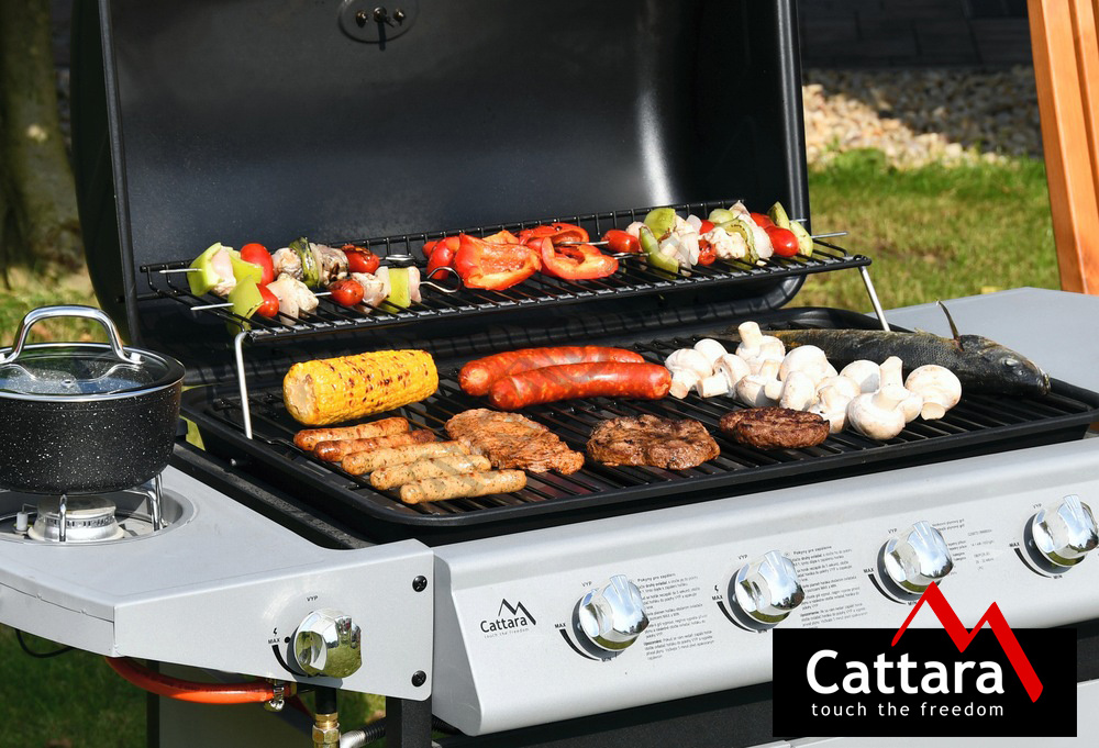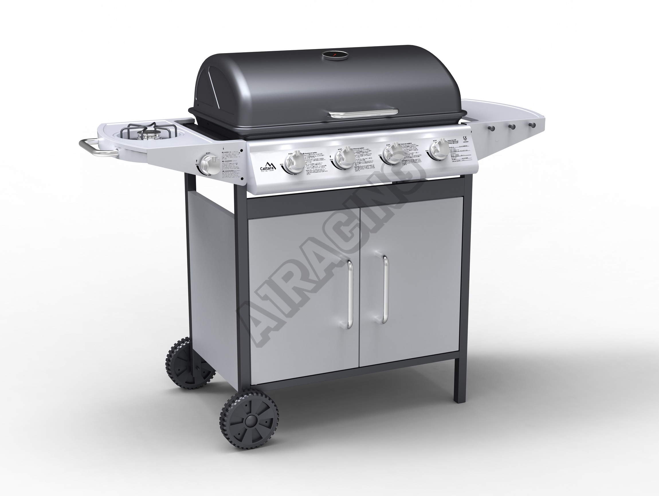 Plynový zahradní gril se systémem Flame Tamer. Hlavní grilovací prostor je osazen 4x hořákem se samostatnou regulací a piezo zapalováním a je vybaven roštem pro udržení teplých pokrmů. Díky možnosti vypnout prostřední hořáky je gril vhodný jak pro přímé, tak pro nepřímé grilování.