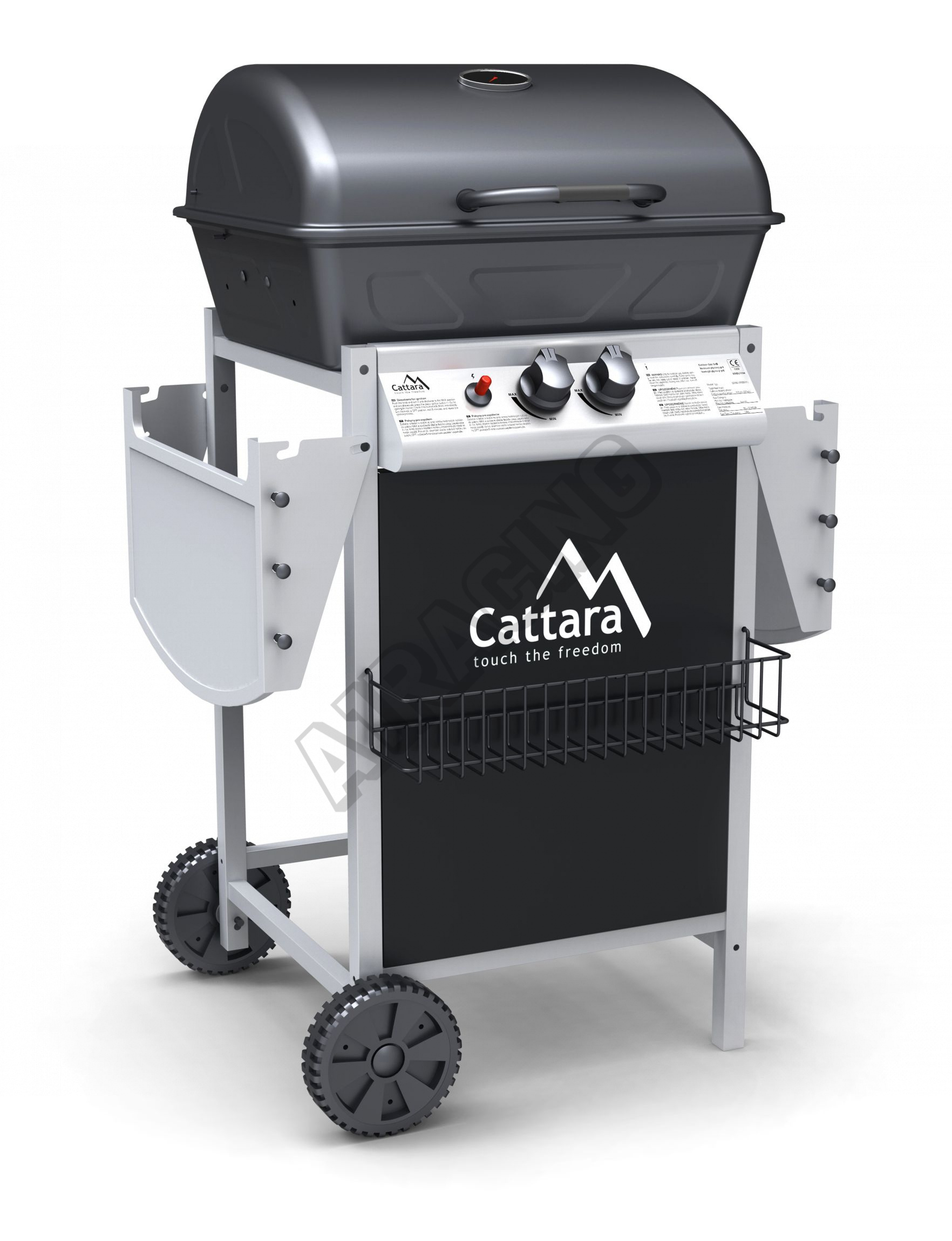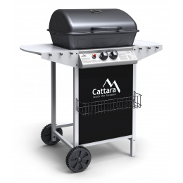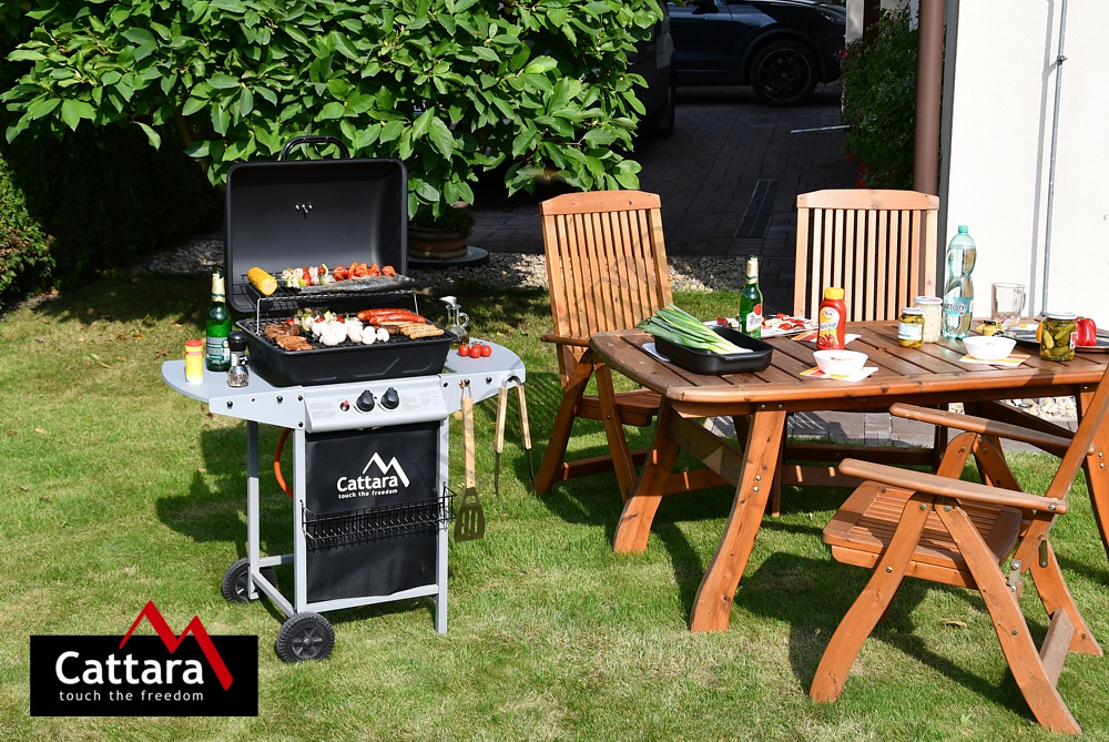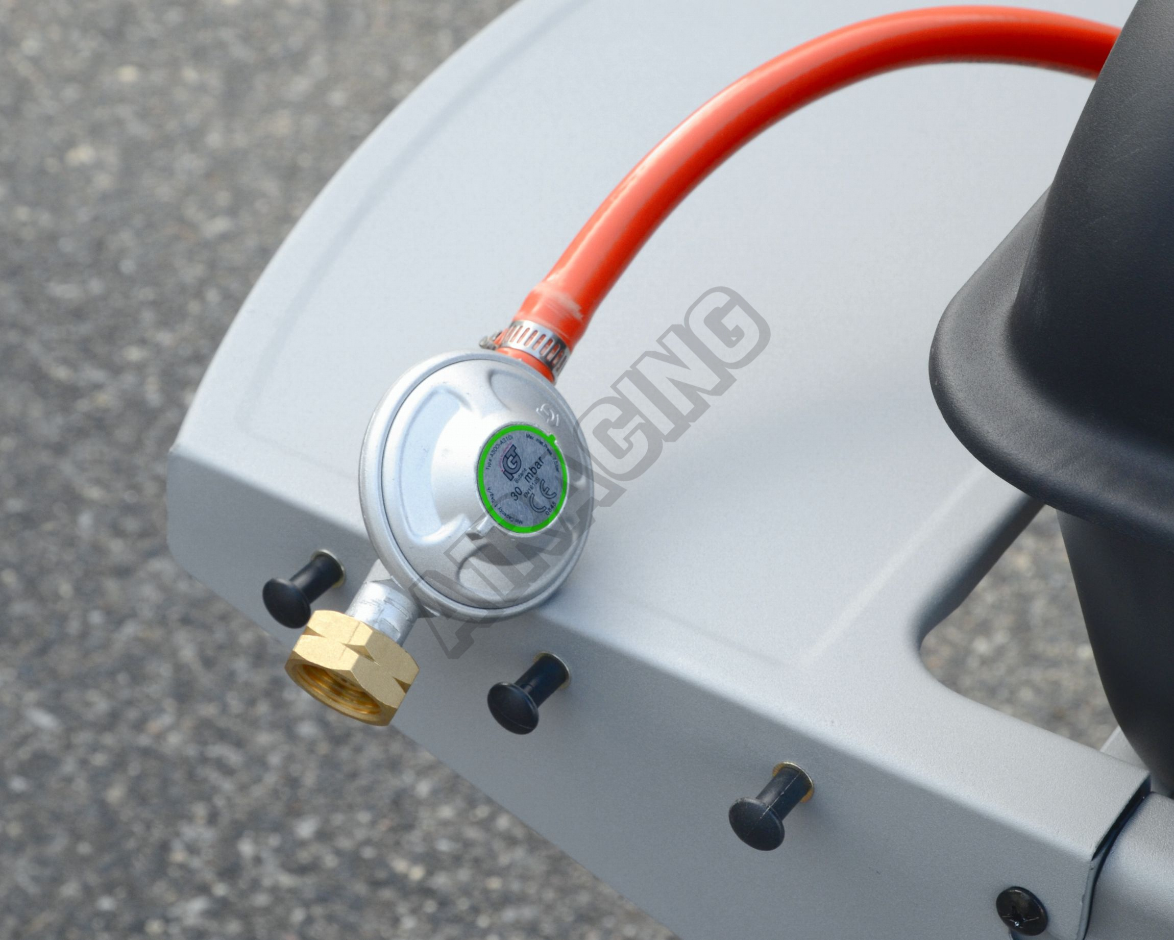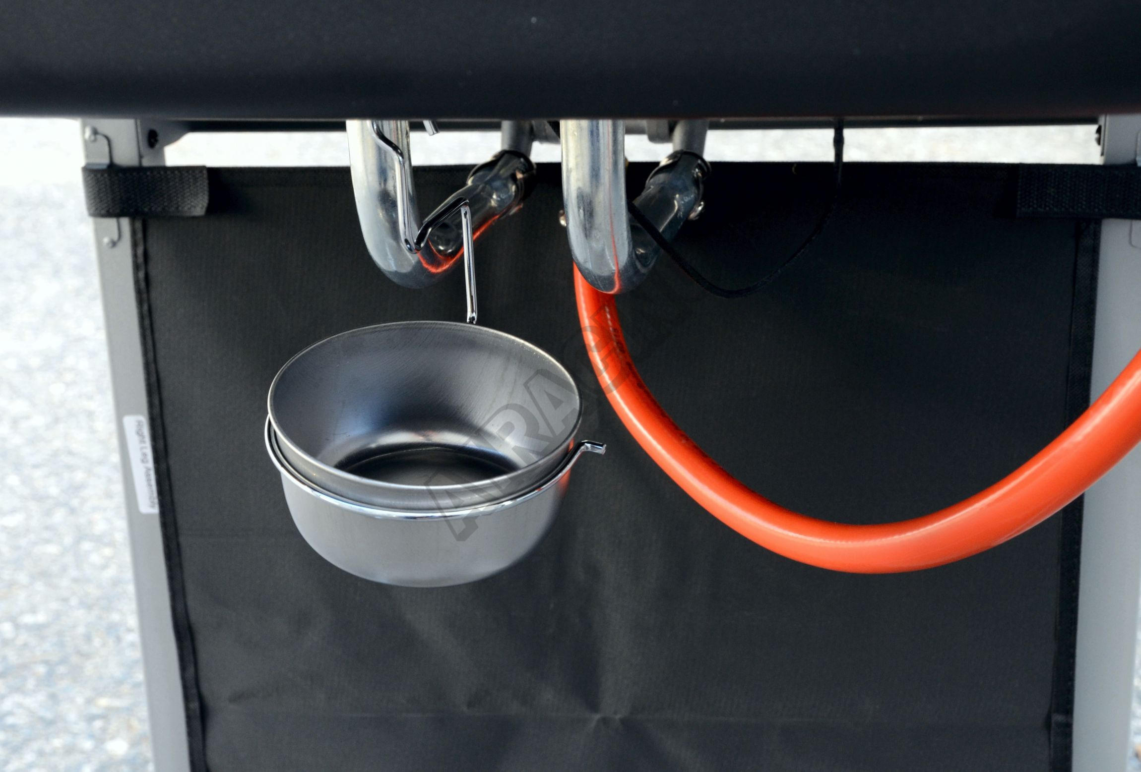 Gril je pojízdný (2 kolečka), je vybaven sklopným víkem a odkládacími poličkami na obou stranách. Součástí je i spojovací hadice k plynové lahvi a redukční ventil. Díky sklopným bočním poličkám se gril snadno skladuje.